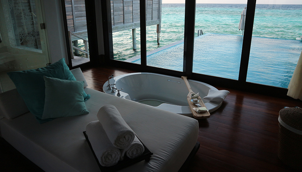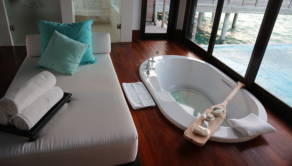 The resort is known for its all-inclusive holiday package and boasts nine accommodation options, including a spacious Four-bedroom Beach Pool residence, but our favourite remains the Sunset Over Water Pool villa. Watch the sky illuminate in streaks of orange, pink purple and blue while soaking in the infinity pool. To further spoil you, the villa provides a second sunset viewing option: a sunken glass-bottom bathtub by the open-air sheltered bathroom.