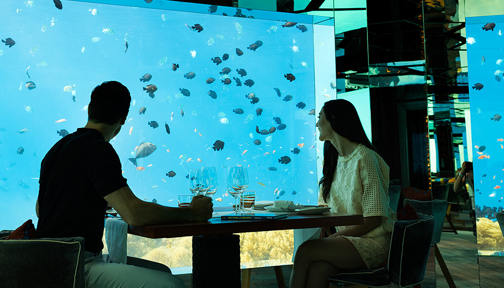 Apart from choosing which activities to take part in during the day, your next hardest choice will be deciding where to dine. Dine by the sea, over and even underwater, and pick from local and international cuisines. Sea, the underwater restaurant, provides a surreal experience as shoals of fish busy themselves in circles. For a truly unforgettable meal, opt for Dining by Design, where the resort will dream up a set meal that’s catered to you and your partner’s preferences.