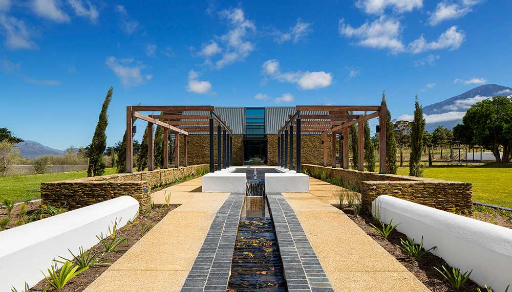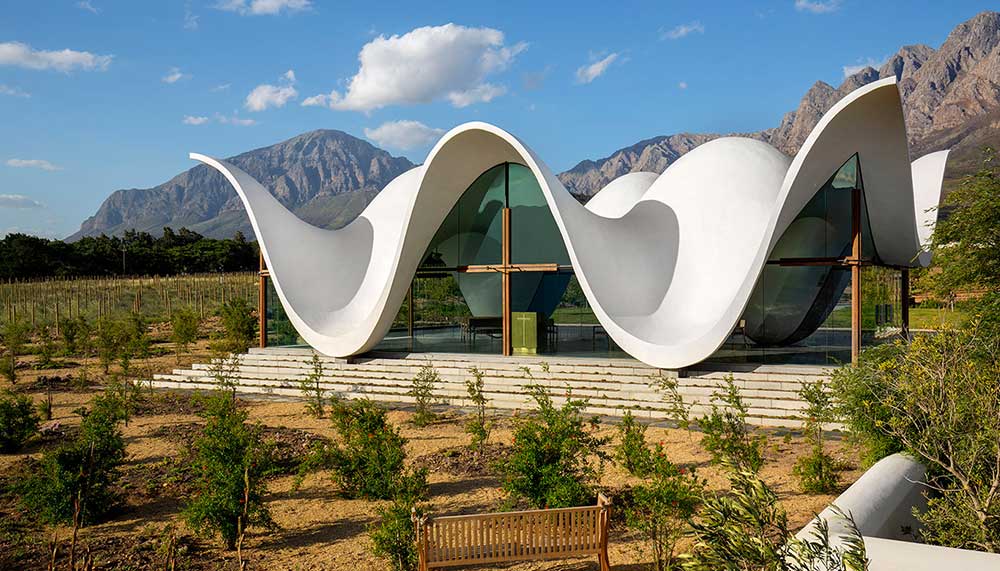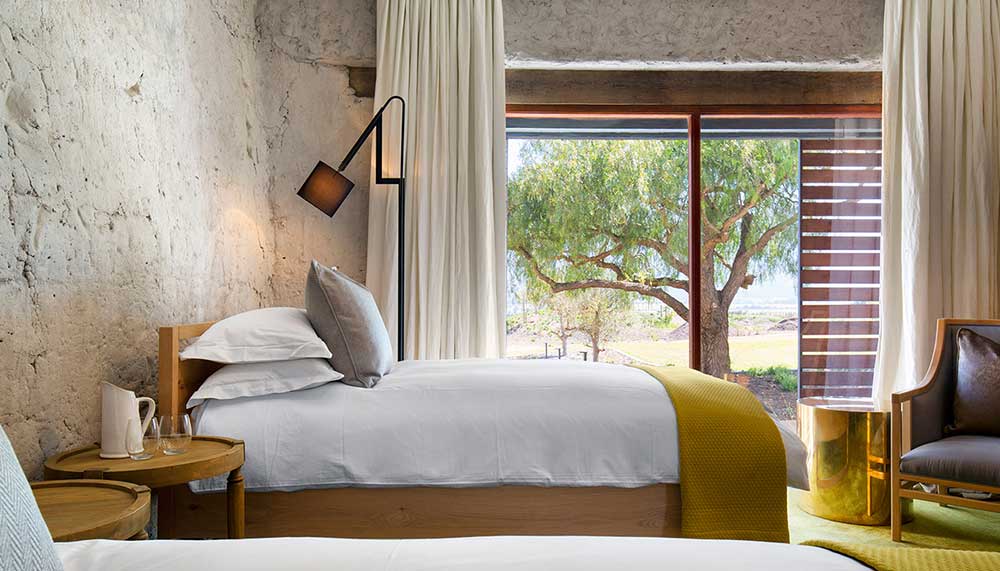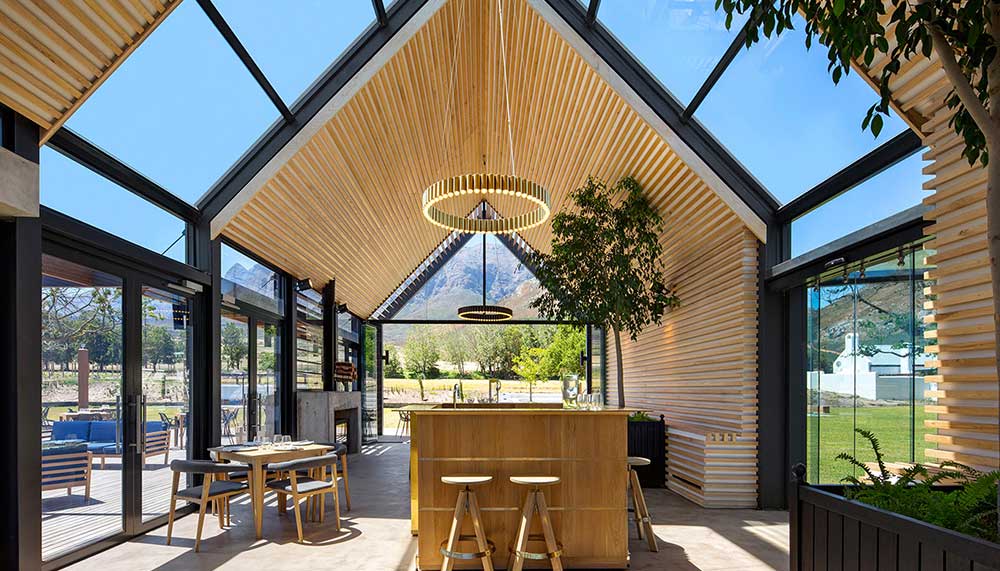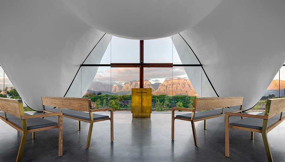 Standing out in a beautifully sharp juxtaposition is the property’s newly built chapel, ideal for weddings or peaceful reflection. Architect Coetzee Steyn from London’s Steyn Studio designed an undulating avant-garde silhouette that is meant to reimagine the curves of South Africa’s traditional Dutch “holbol” gables. A single walkway draws the eye past the chapel’s reflecting pools – which it effortlessly seems to float above – and through its glass walls and utilitarian interior to the mountainous views in the back. Guests of the farm can walk the chapel’s lush gardens, explore the property’s historic Cape Dutch manor house that dates to 1790 (Bosjes means “small bushes” in Dutch), or hike the nearby mountains to try and spot wild zebras, ostriches, and springboks.