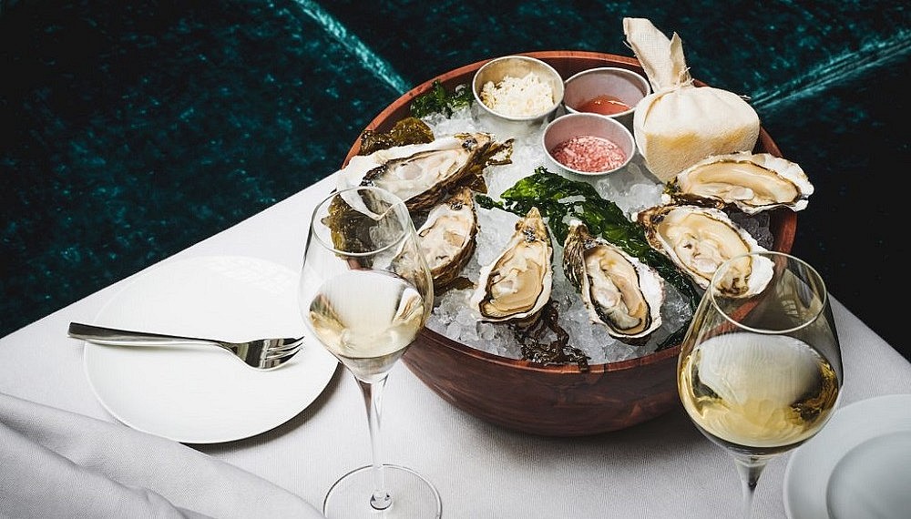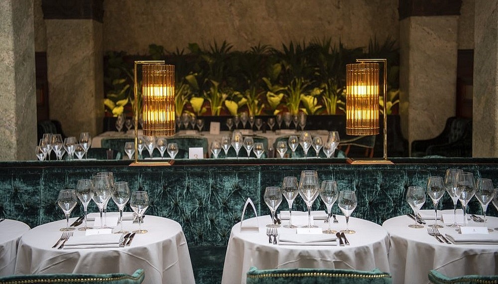 After wrapping up Mediterranean-inspired meals, guests are swept into the neighbouring Papallion Bar, a supremely stylish take on the bank director’s personal office, where craft cocktails are served against a backdrop of gleaming wood walls, a ceiling painted with gilt accents, and low-hanging chandeliers.