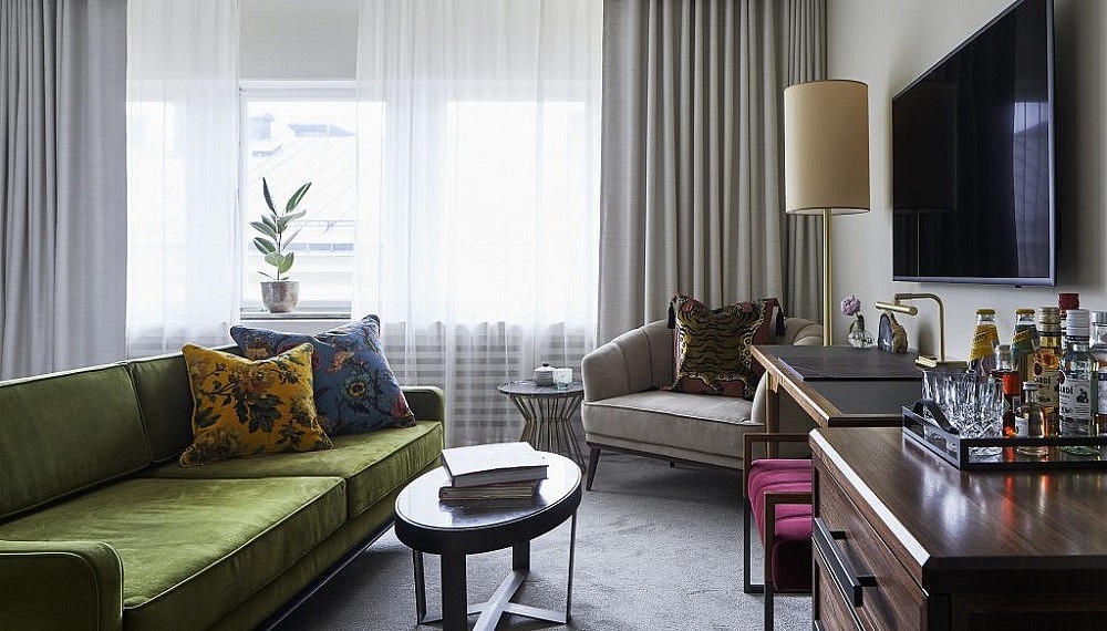 Once they finally do make their way upstairs, guests will find 115 chicly outfitted guest rooms spread across five floors. Brought to life by Swedish interior stylists Ida Lauga and Lo Biurlf, each features a palette of warm neutrals – think rich brown velvets, suedes, and marbles punctuated with pops of grass green and floral patterns – meant to help unwind from the sights and sounds of the city outside.