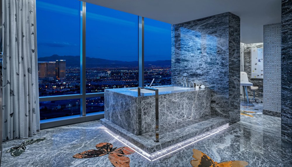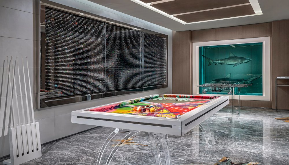 But Hirst didn’t just toss a bunch of his art into the room and call it a day—he chose every material, designed every furnishing and conceived every detail (in collaboration with Bentel & Bentel Architects) down to the carpet and the drapes. The butterfly designs continue on the terrace (featuring an infinity-edge plunge pool that cantilevers high above Sin City) and in the bathroom (which is covered wall-to-wall and floor-to-ceiling with Venus Gray marble). A 13-seat curved bar has been filled with medical waste—a nod to Hirst’s early Medicine Cabinet series, an overt comment on our over-medicated modern society—and topped with Here for a Good Time, Not a Long Time, two vitrines containing a marlin skeleton and a taxidermy marlin. There are also Italian leather sofas draped, again, with Hirst’s butterfly motif; a custom pool table covered in a replica of one of the artist’s colourful spin paintings; and a movie theatre (where we suggest perhaps a screening of the art documentary The Price of Everything to put it all into perspective). Surprisingly, there’s also a wellness theme (perhaps Hirst is on a health kick these days?) with a private healing salt room, two massage rooms and a private fitness centre.