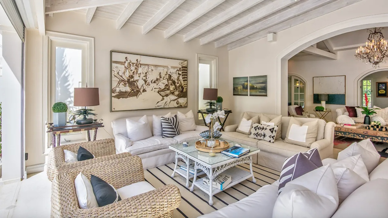 The interior’s relaxed colour palette of soft peaches, greens, and blues mirrors the hues of Barbados itself and natural fibre rugs crafted from jute and sisal add textures that evoke the feeling of walking on sand. Furniture is crafted from natural materials such as rattan and wicker and features tropical prints with lattice patterns and large palm leaves.