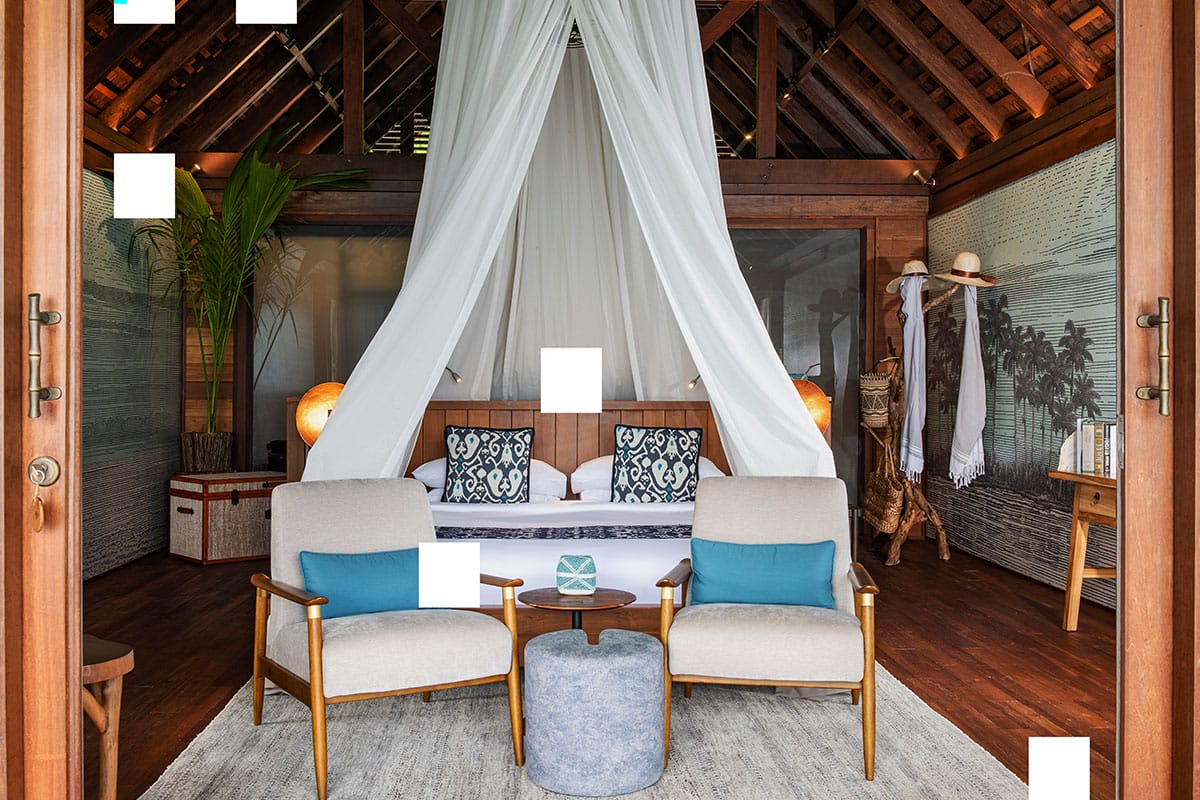 Of the 250 or so islands that are part of the Anambas Archipelago, six belong to Bawah Reserve: Bawah, Batu Tokong, Muerba, Sanggah, Lidi, and Elang. Owner and founder Tim Hartnoll first discovered the islands in 2012 during a family sailing trip. Hartnoll so fell in love with the area that he endeavoured to share the islands with the world. He worked with Singapore-based architect Sim Boon Yang to bring his vision of an unadulterated, paradisical bolthole to life, and, thus, Bawah Reserve opened in 2018.