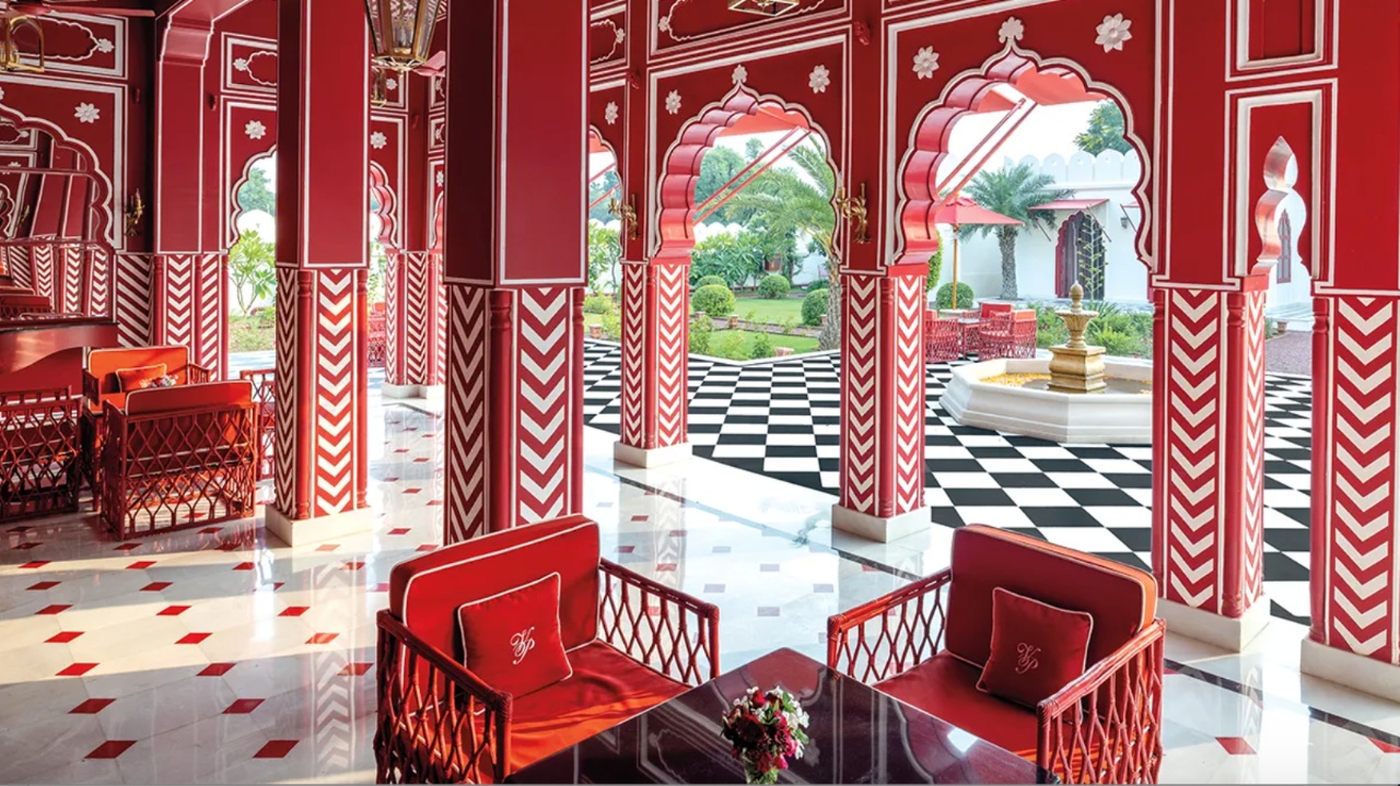 That all changed in 2020 with what proved to be a veritable boom of exclusive hotels. The influx began with the arrival of the Taj Fateh Prakash, a buttercup-yellow mini-palace with just 65 rooms perched above Lake Pichola. The following year, Six Senses raised the portcullis at Fort Barwara, a fairytale fortress with 48 suites—many with terraces and one, the Raja Man Singh, with a crescent-shaped swimming pool—as well as a rambling spa set in a former women’s palace that offers detox and biohacking programs. There’s also the Johri, a five-suite, 19th-century mansion located in a jewelry market, cozier but no less beautiful than its palatial peers, with interiors designed by Naina Shah, a New Yorker of Indian descent whose embroidery company’s work has graced couture pieces by Alexander McQueen, Gucci, and Dolce & Gabbana. And bucolic Villa Palladio, with its exuberant red candy-striped interiors that made magazine covers across the globe. “India lives in her villages, and we wanted guests to have an opportunity to experience what rural Rajasthan represents,” says the Italian Swiss owner and longtime resident, Barbara Miolini.