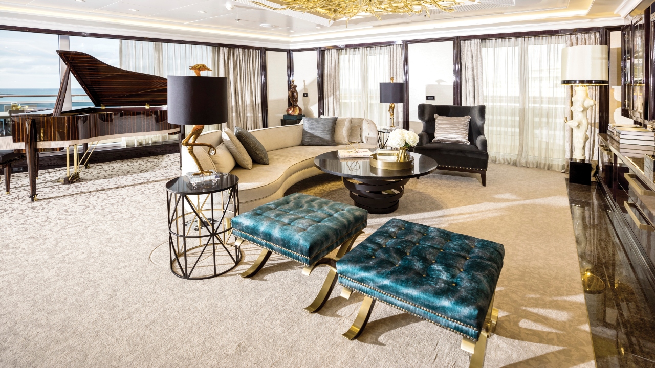 Staterooms start from suites and above, all of which are equipped with balconies, marbled bathrooms, and a multitude of premium touches, including walk-in wardrobe, customisable complimentary minibar, welcome champagne on ice, and refreshed floral arrangements. The top-of-range Regent Suite offers more than 4,000 sq ft of space, including a Steinway piano, two bedrooms with private balconies, and an in-suite spa retreat.