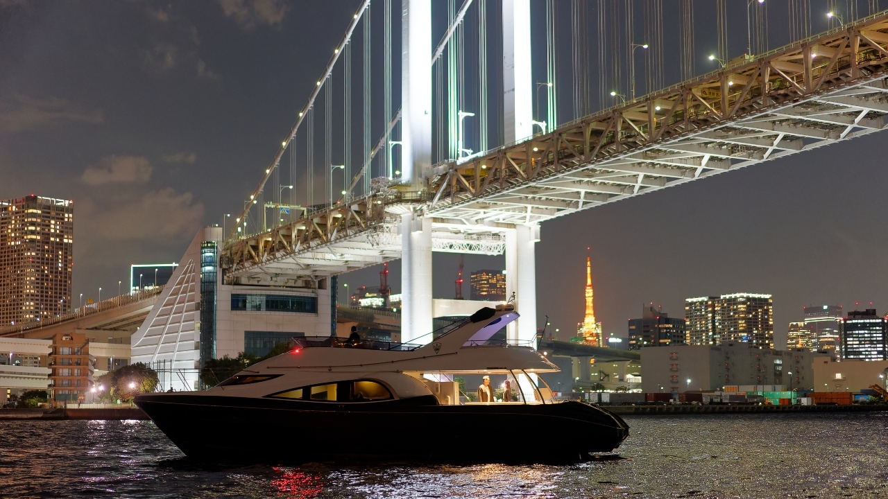 Lead image: A night-time view of Tokyo’s Rainbow Bridge from a privately chartered cruise with Reserved Cruises.
