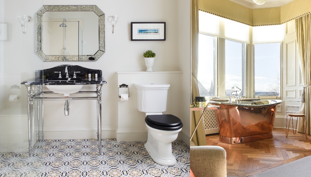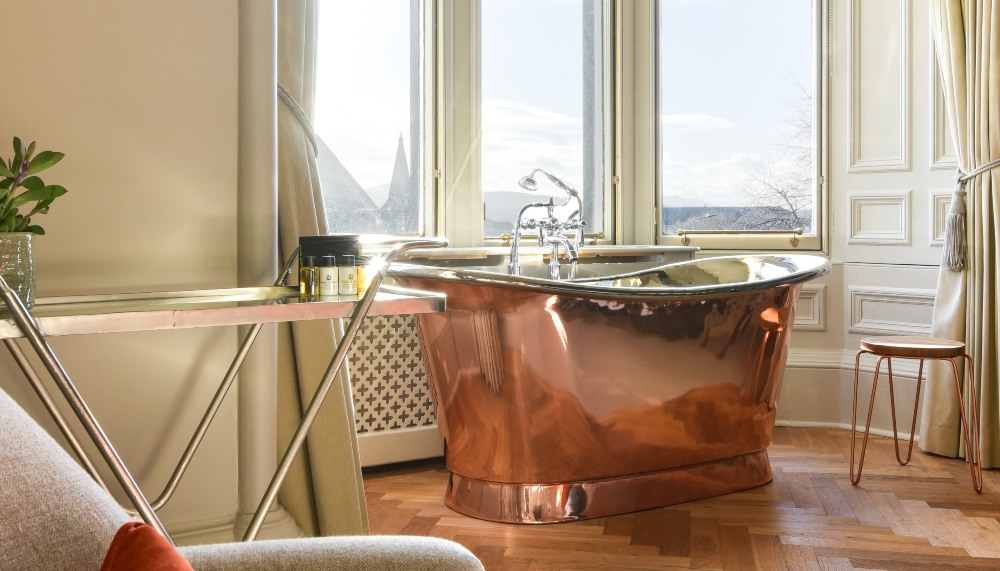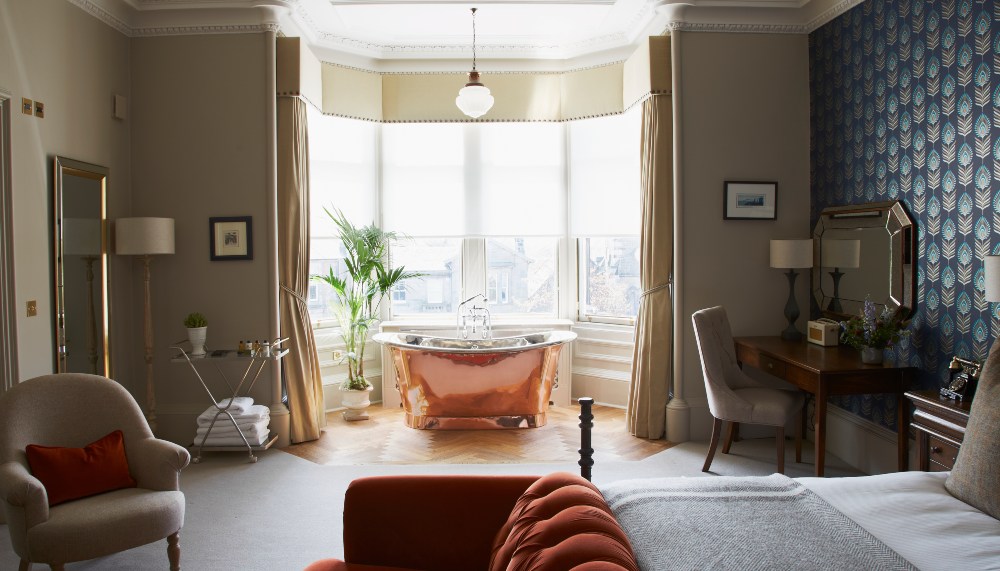 The first thing you’ll inevitably notice as you enter The Dunstane Suite is the stunning roll-top copper bath situated right in front of the bay windows for maximum impact. “Oh yes, we do get calls about guests forgetting to close the curtains when they’re in the bath!” laughs Samantha Wright, General Manager of The Dunstane Houses, which is composed of 35 suites and rooms spread between two Victorian townhouses.