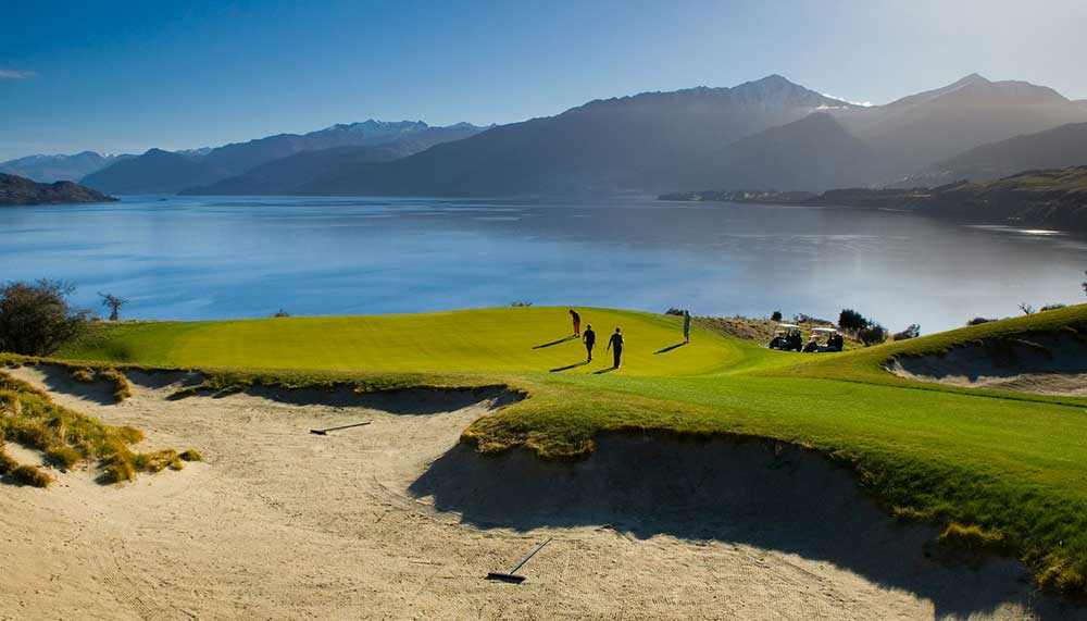 About 20 minutes outside of Queenstown, on the shores of Lake Wakatipu and in the shadows of the perfectly named Remarkables mountains, is a public course that offers as fine a combination of spectacular scenery and great golf as can be found anywhere. Holes on this Darby design climb as steeply as the nearby mountains, drop down to the lake, then repeat the ups and downs, thrilling and enchanting with the clever movement and often extreme use of the dramatic elevation changes. From the front nine, golfers can watch parachutists jump from planes and float down right next to the course.