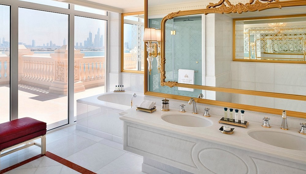 This lush atmosphere is found throughout the hotel — from the unending private beach to the spa, which boasts 23 treatment rooms, two spa suites and the city’s largest indoor pool. And though we’d recommend getting out into the city to sample restaurants from the megawatt celebrity chefs that have descended upon the city, with eight restaurants — including the first in the UAE from Alain Ducasse and a European-style tea salon complete with a Blünther Supréme Edition Louis XIV grand piano — guests wouldn’t be blamed if they stuck closer to their seriously lush accommodations.