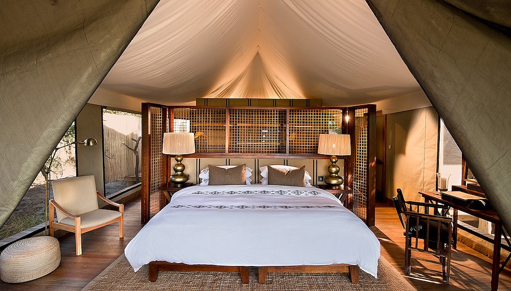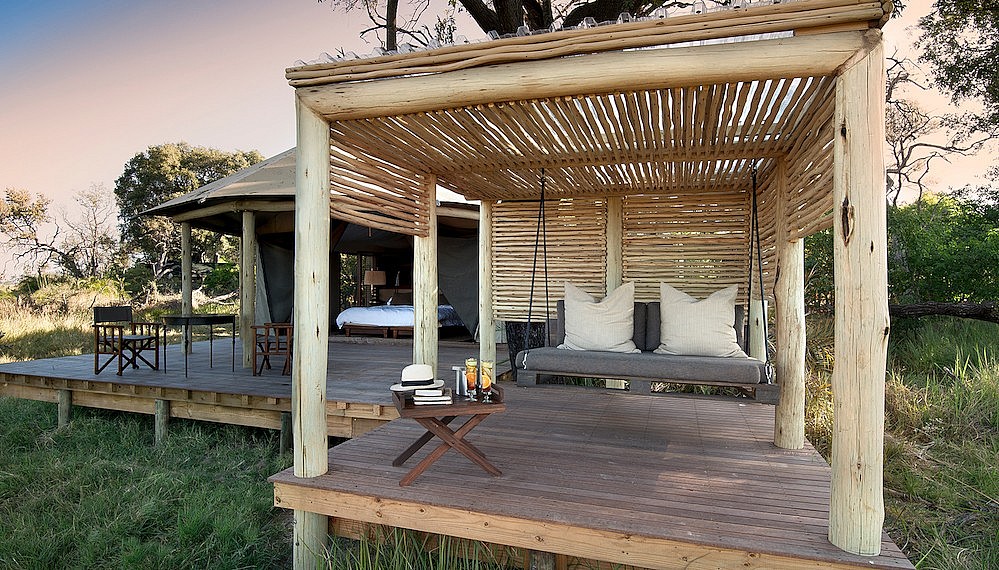 Phinda’s earthy-chic aesthetic is mirrored at andBeyond Nxabega Okavango Tented Camp, where Botswana’s Okavango Delta takes centre stage. Prime vistas of the surrounding savannah — and the elephants, lions and zebras that call it home — can be found at the camp’s swimming pool, lined with salas and padded loungers for prime game viewing. In the newly renovated guest rooms, natural materials like local timber, reed and thatch juxtapose plush furnishings and leather accents. Meanwhile, a new open-air boma on the Delta’s edge — partially covered by the large, looming ebonies above — is the perfect way to end a long day of exploration in the bush.