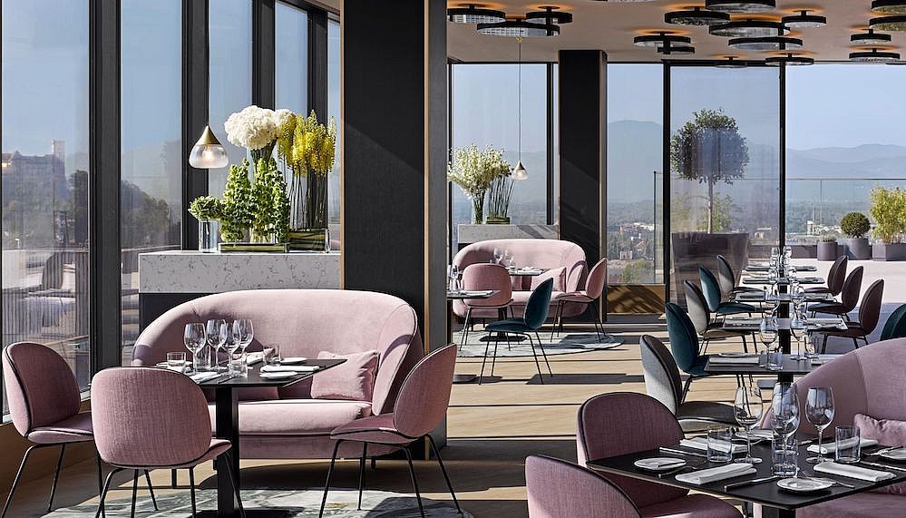 Located just steps away from the ornate Tivoli Park, the new InterContinental is a beacon of modernity in the sleepy European city. With shimmering glass walls that soar 20-stories high, the building stands apart from the landscape of Secessionist and Baroque buildings below, offering sweeping views of the charming city and imposing Alps from almost all of its 165 rooms and suites. Inside, the property’s sleek and stylish rooms and suites make the most of this view — complementing the city’s palette of green, dusky blue, and terracotta with neutral furnishings and luxe leather accents.