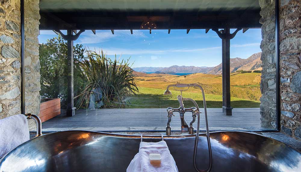 The homestead itself is also eco-friendly with an on-site water supply and solar panels. Traditional schist stone sourced from the property and recycled wood grace the interiors of the lodge’s two suites and the adjacent cottage suites that are immersed in a native beech forest and boast unobstructed views of the Motatapu River, the surrounding mountains, and the property’s stables.