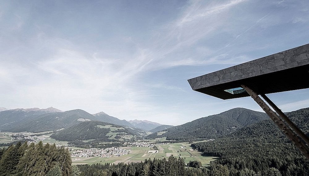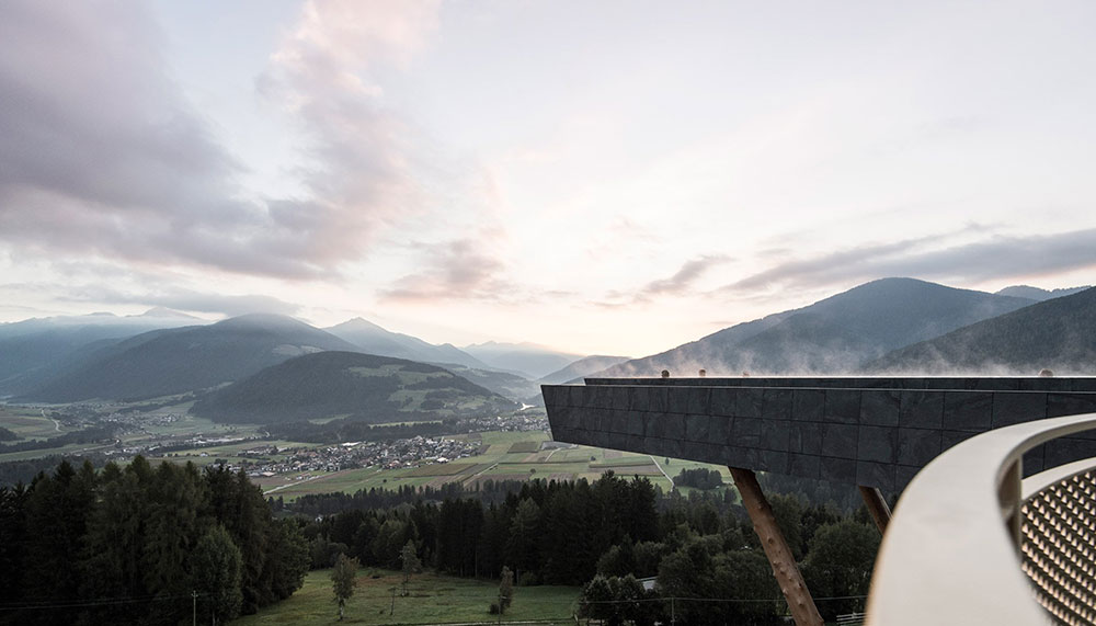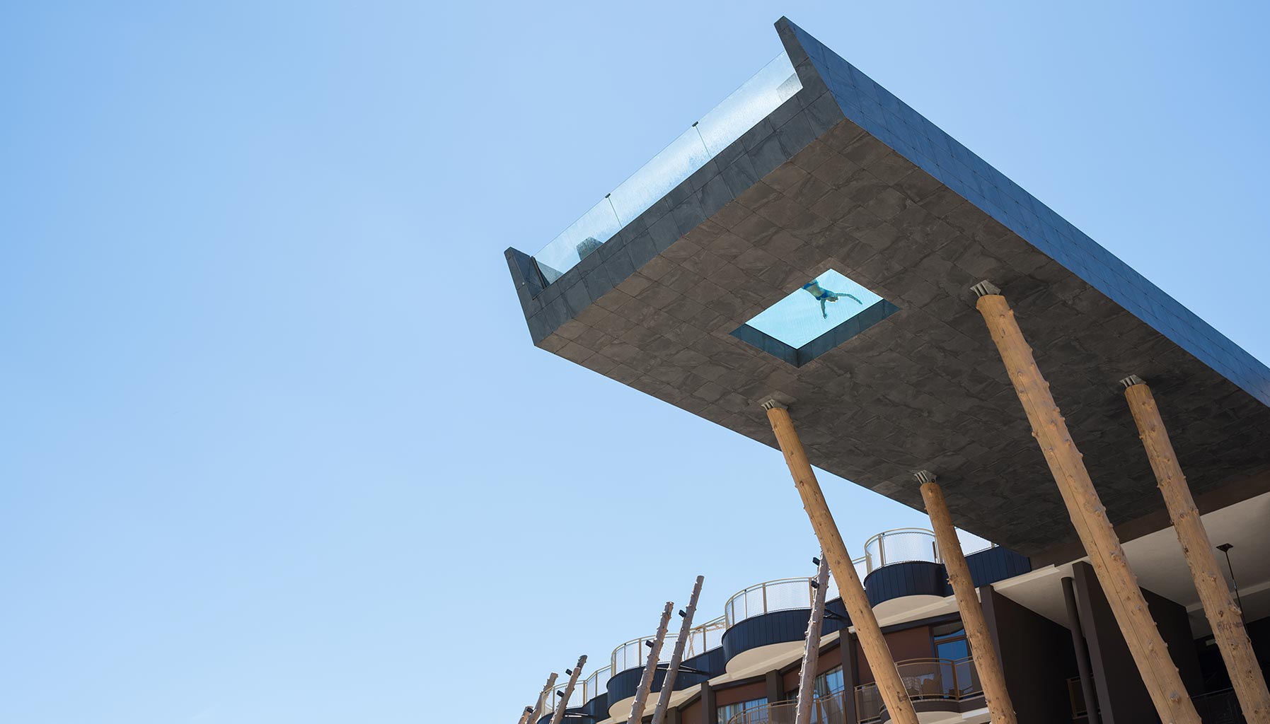 Supporting the cantilevered pool, which juts 17m from the façade of the hotel, are trunks of native larch trees stripped of bark. It somehow softens the blow of the angular pool, helping it to blend into the natural landscape. The trunks also make an appearance across the exterior of the curved hotel, unifying the aesthetic and also acting as room dividers and beams. The aim of the design, according to noa*, was to give the ‘swimmer the feeling of floating – weightlessly between heaven and earth.’ If that was the goal, then consider this a hat-trick.