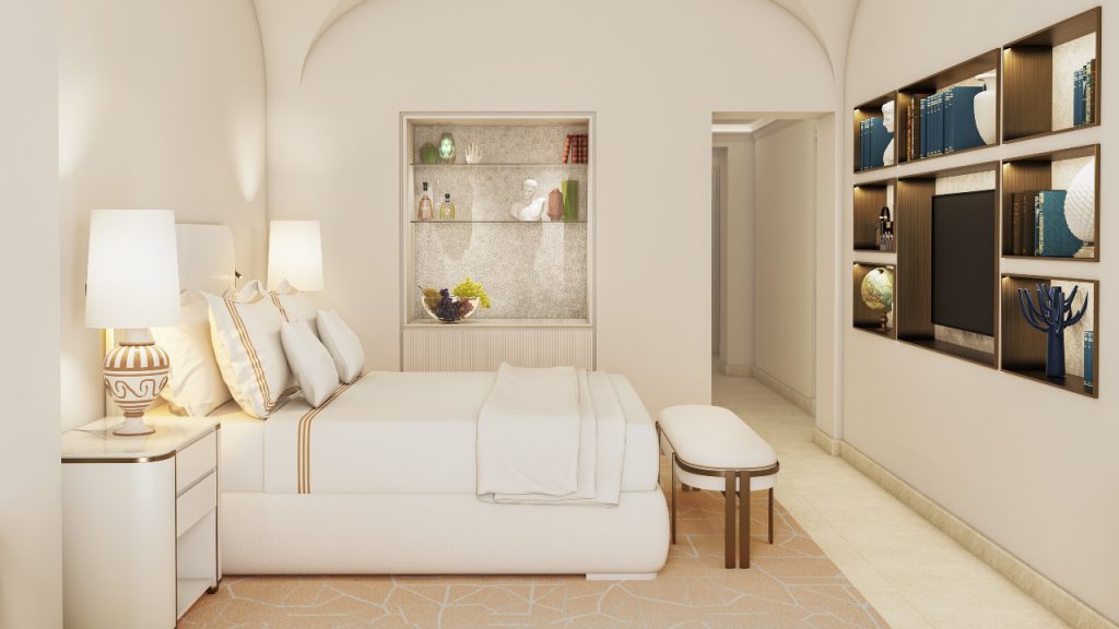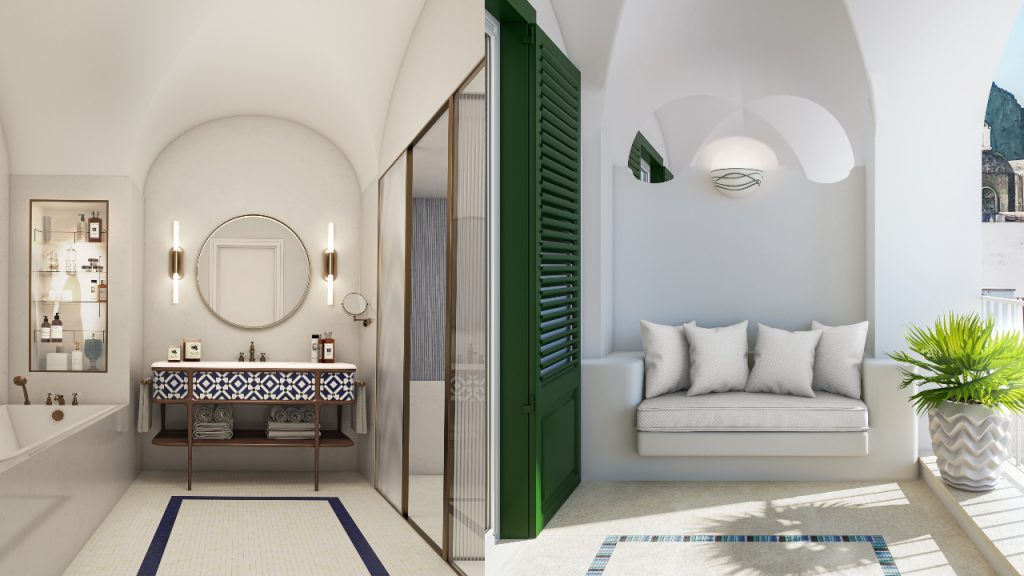 The hotel’s interiors, conceived by designer Francis Sultana, is an ode to the original. “As Capri’s first ever hotel – Hotel La Palma opened its doors over 200 years ago – there was a real sense of responsibility to respect its heritage and legacy,” Sultana says. “decided to go the restoration route to preserve that quintessentially Capri style – The shells and stucco mouldings were just so beautiful and where they were lost we remade them, where we had to add new details, we designed them all in keeping with the building’s historical narrative . We have preserved the railings , the facades, and the architecture of the terraces. The locale, of course, plays a huge role throughout the project and I also created new vaulted ceiling in the typical Capri style.”