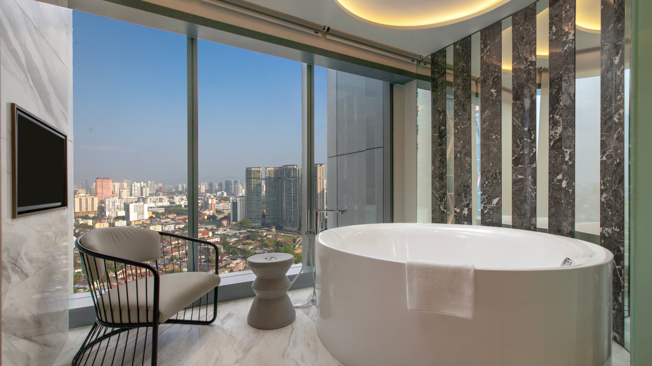 Many habitual travellers value ease and proximity, and this hotel delivers on both fronts. Beyond its immediate vicinity to Kuala Lumpur’s famed Petronas Twin Towers and public transport services, the 33-story building is set beside embassy offices, a myriad of dining spots, boisterous bars, and numerous retail malls—making it an ideal base for navigating the city. The property is enveloped in an undulating crystal glass facade, perched at the apex of a triangular site overlooking the neighbourhood and the Twin Towers. Inside, the uncluttered and elemental composition echoes the calming influence of Malaysia’s tropical rainforests, featuring chandelier-esque lighting fixtures reminiscent of tumbling raindrops as well as bronze sculptures that mimic the intricate inner patterns found within a sliced tree trunk.
