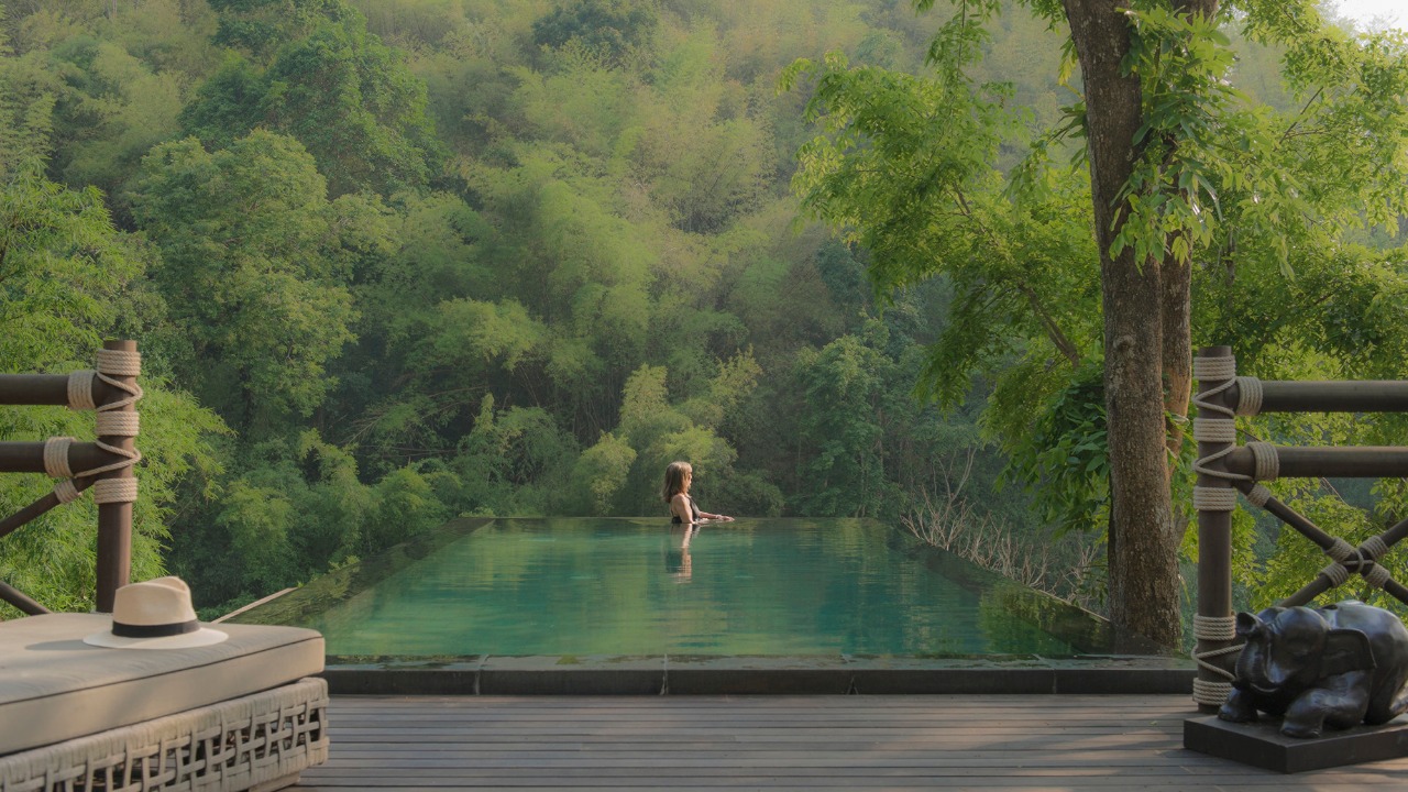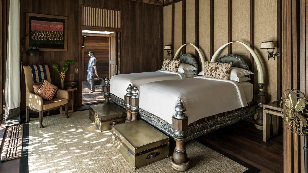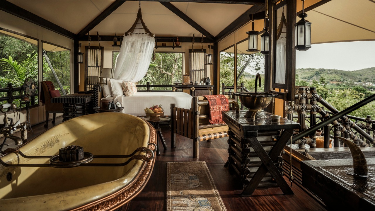 Surely though, the show’s location scouts wouldn’t pass over the dramatic cliffside setting of the Four Seasons Tented Camp in the Golden Triangle. The Bill Bensley-designed 15-tent property is shrouded by a sea of bamboo trees that often vanish with the cover of morning mists, along the Ruak River that runs off the mighty Mekong. It’s this unconventional Bensley project that allowed the designer to riff off, creating even wackier properties in the region in the decades since the camp’s opening.