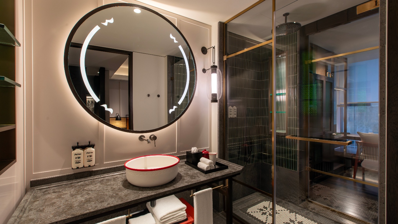 Sustainability is one of the core pillars in this newly opened hotel. Upon entering the lobby, guests will come across a living vertical garden, a central staircase crafted from repurposed old railway sleepers and reinforcement steel bars salvaged from the hotel’s construction site, as well as a large-scale installation made entirely from recycled plastic bottles. Feature lights are made from upcycled bottles, artworks are crafted using old books, and reception desks are assembled from rescued tree roots found in Malaysia. Every corner permeates local character and Malaysian traits—from tiffin carriers and Hup Seng cracker tins to rattan furniture motifs in the guest rooms, ornate hand-painted Peranakan tiles, and pages from nostalgic Chinese calendars adorning the interior of wardrobes. The hotel distils authenticity into intimate spaces that pay homage to the history and traditions of its location, encouraging guests to explore the multifaceted aspects of Kuala Lumpur. “We only provide amenities upon request to cut down on waste and only offer water in glass to minimise our impact on the environment,” Garside says.