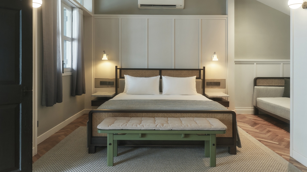 “Details and elements were also used as inspiration for the new room designs as an ode to its heritage,” Neoh said. “For example, custom-designed elements, like the bespoke luggage racks and clothes hooks, are reminiscent of vintage cloak hangers. The harmonious palette of olive green, off-whites, and dark wood were chosen to echo the original furniture in the rooms.”