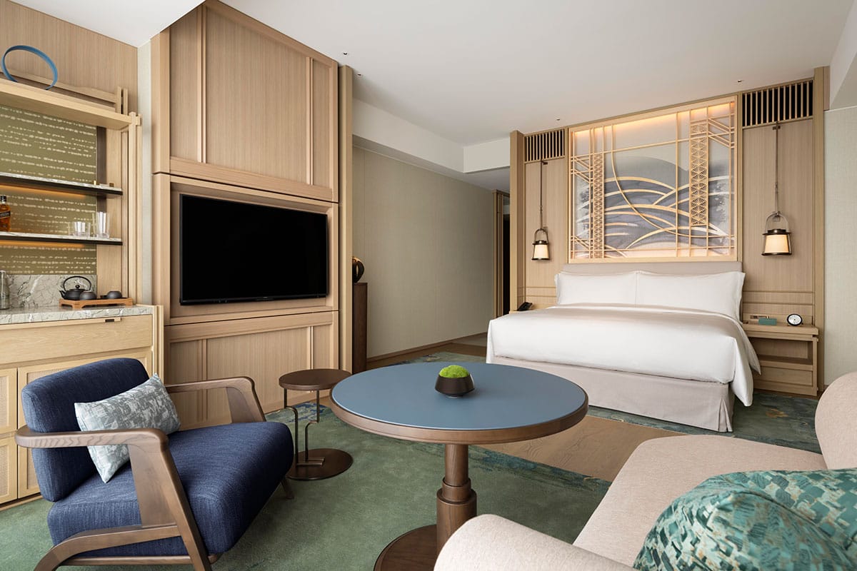 Dubbed the ‘Grand Residence in the Park’, the Waldorf Astoria Osaka features opulent rooms with floor-to-ceiling windows that start at 46 sq m and reach 193 sq m, if one opts for the Presidential Suite. But if the latter is unavailable, the Waldorf or Astoria penthouses, each clocking in equally at 146 sq m, are more than worthy options. To reach these residences, guests pass through The Arcade, lined with timber archways inspired by tori gates and Peacock Alley, the passageway that once connected the original Waldorf and Astoria hotels in New York City. Then, once you’ve checked in (personally in your accommodation, not the front desk), unpacked, and settled in, you’ll gradually but definitely feel you’re in a Waldorf Astoria.