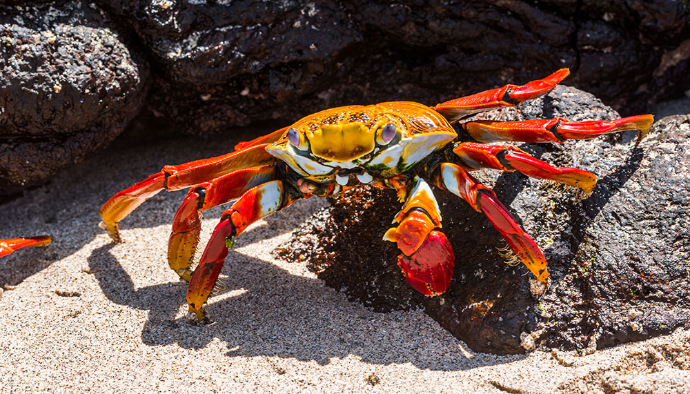 Ashore at Punta Espinoza via the ship’s sturdy military-grade zodiacs, we take turns to step onto lava the colour of espresso. It takes a little while for the eyes to adjust and for me to see that the black rock is encrusted with fat, soot-hued lizards, some the size of housecats. They lay on top of each other, absorbing the heat of the lava rock between dips in the pounding surf. These are marine iguanas, one of the most famous of Galapagos’ all-star wildlife cast and a species found nowhere else in the world. These sea-loving lizards, described by Darwin as ‘imps of darkness’, who first noticed their evolutionary divergence from iguanas on the mainland, can dive to nine meters in search of red algae, but must then return to the lava beds to warm up. Protected and complacent, these tiny Godzillas pay us no heed as we circle their collective clumps and trace the rugged coastline.