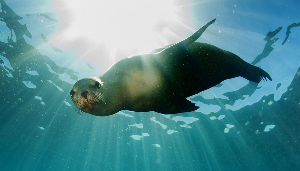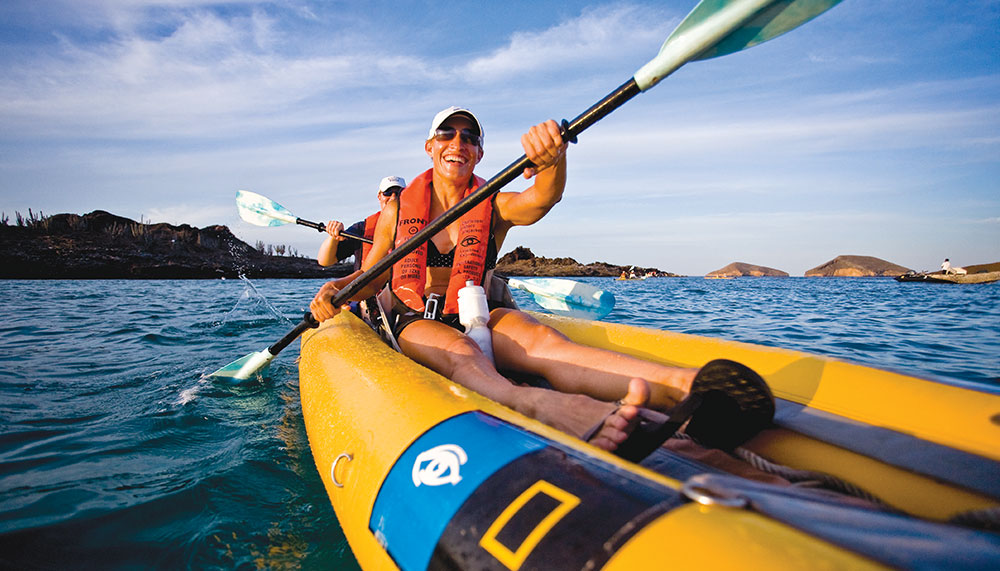 Wildlife is always a feature of daily shore excursions, hikes and snorkelling trips. On Isabela Island we follow a path of prickly pears and track pink flamingos with our National Geographic-trained photo guides, being greeted by shy Galapagos penguins and vibrant red and yellow land iguanas, the other branch of the evolutionary split. At Urbina Bay, a black sand beach at the base of Alcedo Volcano, we spy the tracks of sea turtles arriving to breed. On a snorkelling trip along the rocky coastline of San Salvador we swim with cheeky sea lions whizzing through the water like plump, whiskered jetfighters. Below, black-tipped reef sharks samba their way through the currents while green turtles drift in the depths, unfussed by our incursion. At Kicker Rock, a granite fang that juts from the ocean, we hover above a pair of graceful spotted eagle rays and try to keep up with juvenile sea lions, inquisitive little showoffs that love frolicking with aquatically-challenged visitors like us.