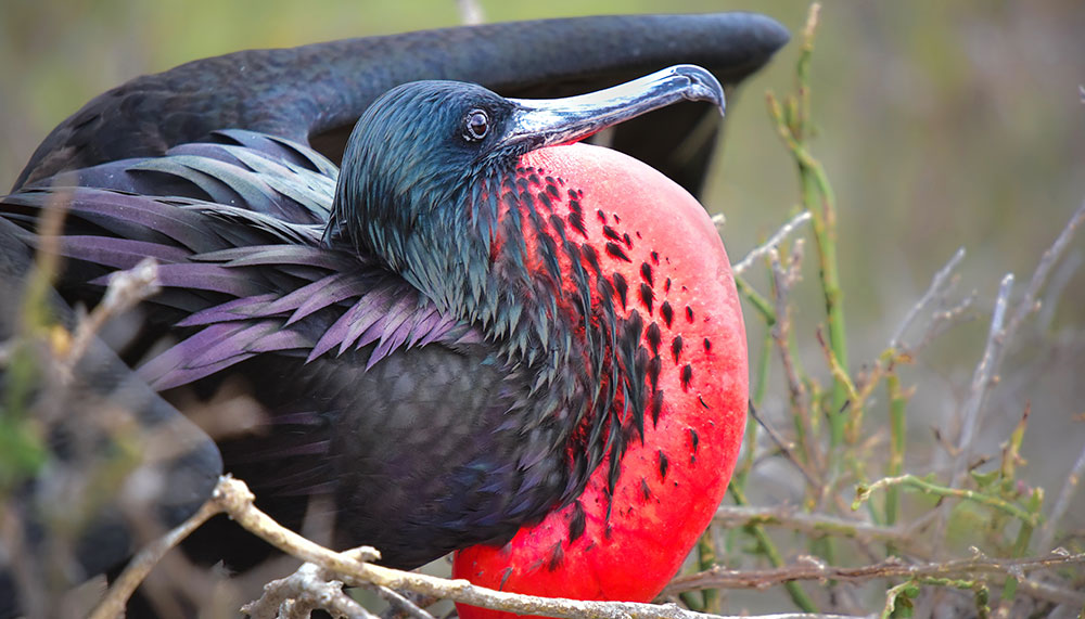 We have our first taste of Galapagos’ stunning wildlife on North Seymour Island, home to the largest population of blue-footed boobies in the archipelago. Boobies are the rock stars of the Galapagos; while they don’t have the reptilian thrill of the iguanas or the playfulness of the sea lions, their eye-catching pastel blue feet make them a firm favourite with camera-toting travellers, especially during breeding season when they perform comical mating dances which resemble a couple of plodding bobbies. They’re joined by frigate birds in their amorous inclinations; North Seymour is also home to one of the largest populations of these dynamic, jet-black sea birds. During mating season, males puff out distinctive red gular pouches on their chests in an attempt to get a little love.