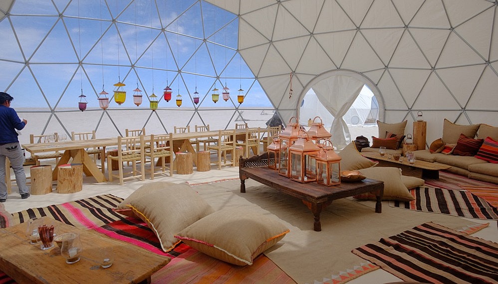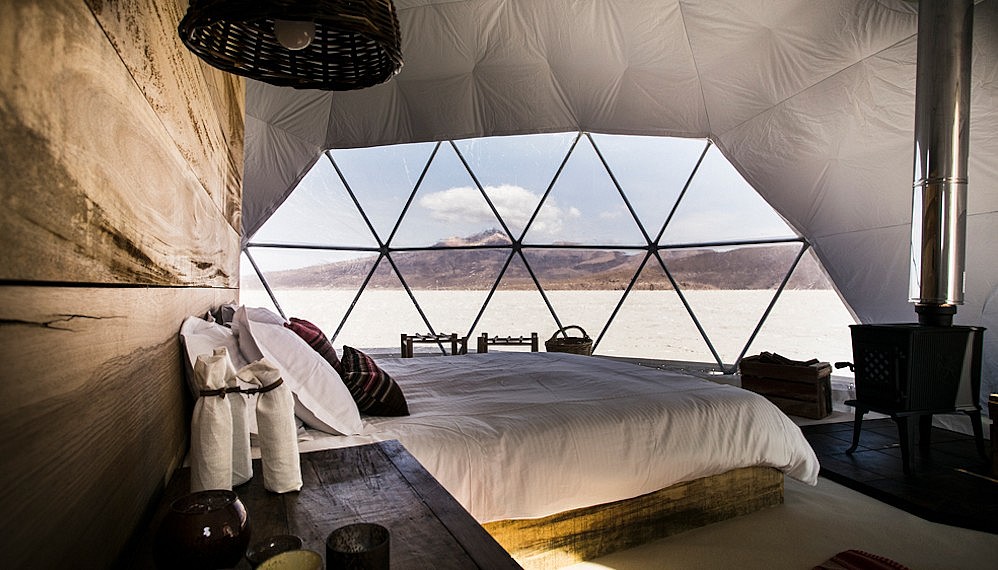 Designed by Amazing Escapes (the same company that Black Tomato tapped to build its temporary camp), Katchi is composed of a series of white domes that rise like a moonbase out of the lunar landscape. The solar powered, igloo-style structures are all elevated on a wooden platform above the salty surface — a design that both protects the fragile landscape underneath and ensures the lodge can remain open during the annual rainy season, when the Salar’s surface turns into a watery mirror that reflects the vast expanses of Bolivian sky above.