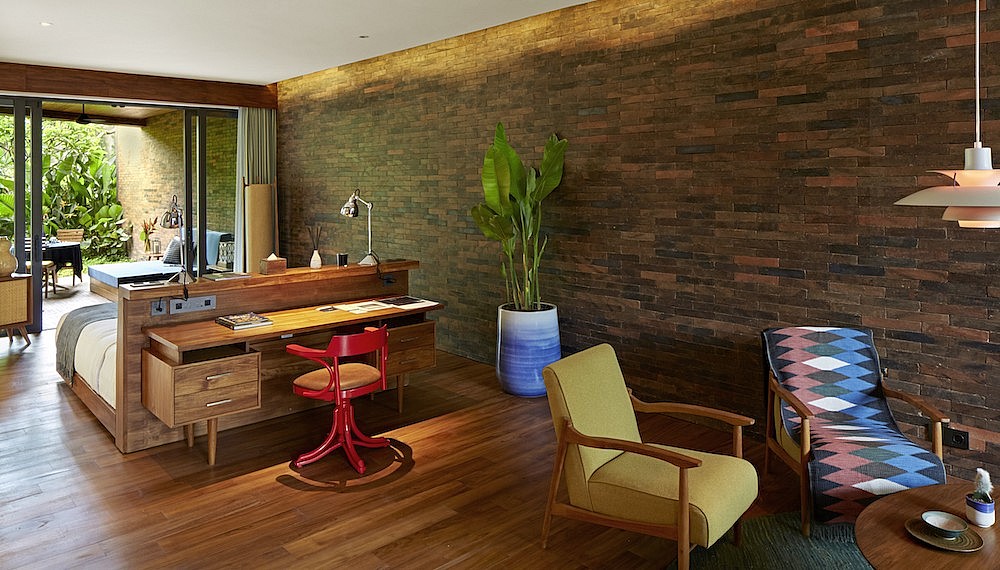 As the only architectural vernacular embraced globally, Balinese style pavilions, bales and water features is something we have become familiar with globally. Yet in the heart of Seminyak, a resort named Katamama has boldly departed from this beloved form, or so it would seem. From the first impression, the angular brick mass of its exterior seems at odds with the island’s typical organic feel but is somehow familiar. That’s because the multi-tonal bricks are the same rich ochre bricks found in palaces and temples throughout the island. Indeed, while it may not seem obvious to the casual onlooker, the spirit of Balinese architecture is very much alive here.