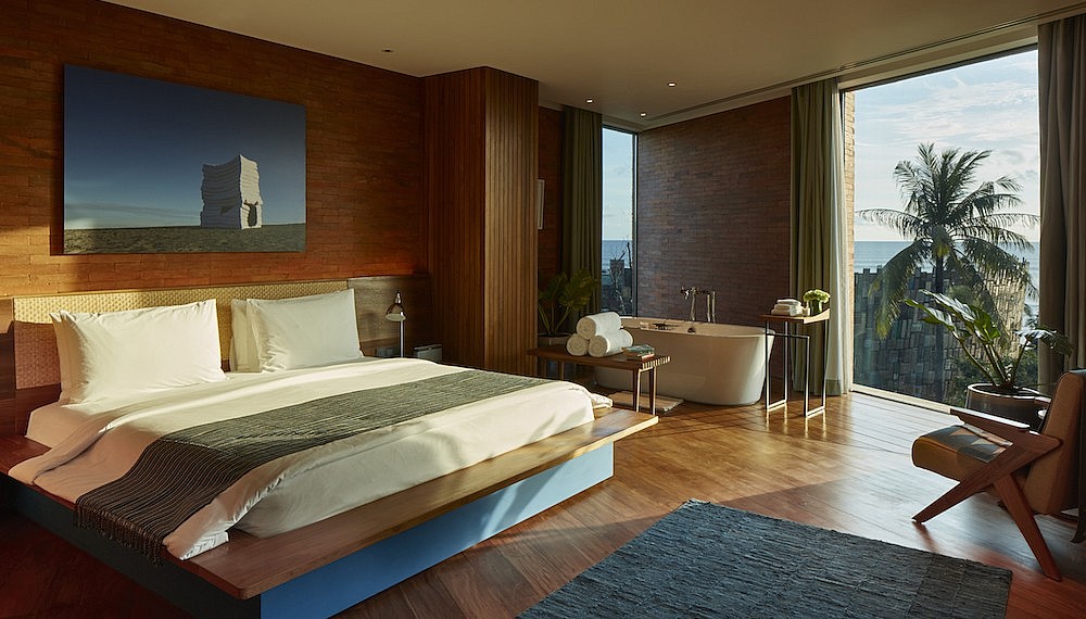 Each space is a showcase for local design and craftsmanship executed by Ronald Akili, CEO of PTT Family and Singapore-based design company Takenouchi Webb. As one of Indonesia’s leading entrepreneurs, Akili is known for his passion for the mid-century look and Katamama’s interiors, fixtures and furnishings reflects this craft-focused take on hospitality – from the Louis Poulsen lights to vintage Hans J Wegner rocking chairs and Arne Jacobsen seats, some from Akili’s personal collection. Other additions were created especially for the hotel, down to the table runners, the work of Bali-based husband-and-wife team Tjok Agung Indigo, to the reed diffuser bottles, a collaboration between Japanese designer Hiroshi Fujiwara and Ubud-based Gaya ceramics.