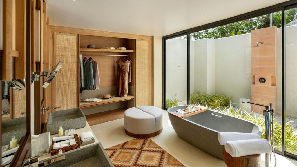 To best reflect the sprawling natural beauty that surrounds the island Maldivian architectural firm GX Associates, the resort employed the help of Singapore-based interior design company URBNarc who made expert use of natural materials. The interiors of Kuda Villingili feature custom, eco-friendly furniture and fittings including carpets manufactured from recycled plastic bottles inspired by the ocean and highlighting local flora and fauna. Traditional Maldivian art pieces can also be found dotted all over the resort.