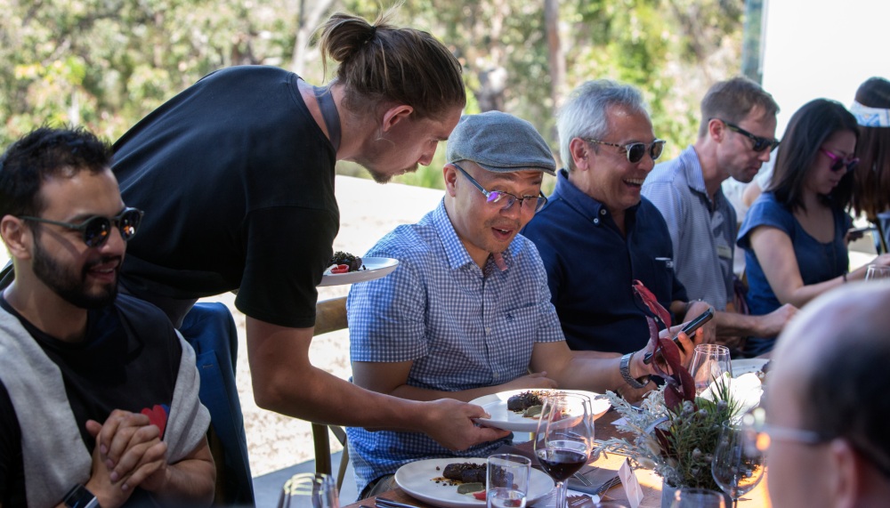 But that’s the thing about Lexus, where getting lost in one is essentially a treat in itself. A wrong turn on the way to Feast in the Forest at Leeuwin Estate’s Safari Club uncovers a view of Redgate Beach’s rugged coastline and a technicolour sunset so spectacular that it borders on the surreal. Eventually, we find a barn surrounded by jarrah and marri trees, accompanied by the cackling of kookaburras and the sight of Paul Carmichael, Executive Chef of Momofuku Seiōbo in Sydney, wreathed in smoke as he stokes a live fire. From the flames come the heady, extroverted Barbadian flavours that recently netted him the Australian equivalent of three Michelin stars: jerk pork jowl drizzled with abalone caramel, fish heads bathed in hot sauce, and caulini laced with piquant dog sauce.