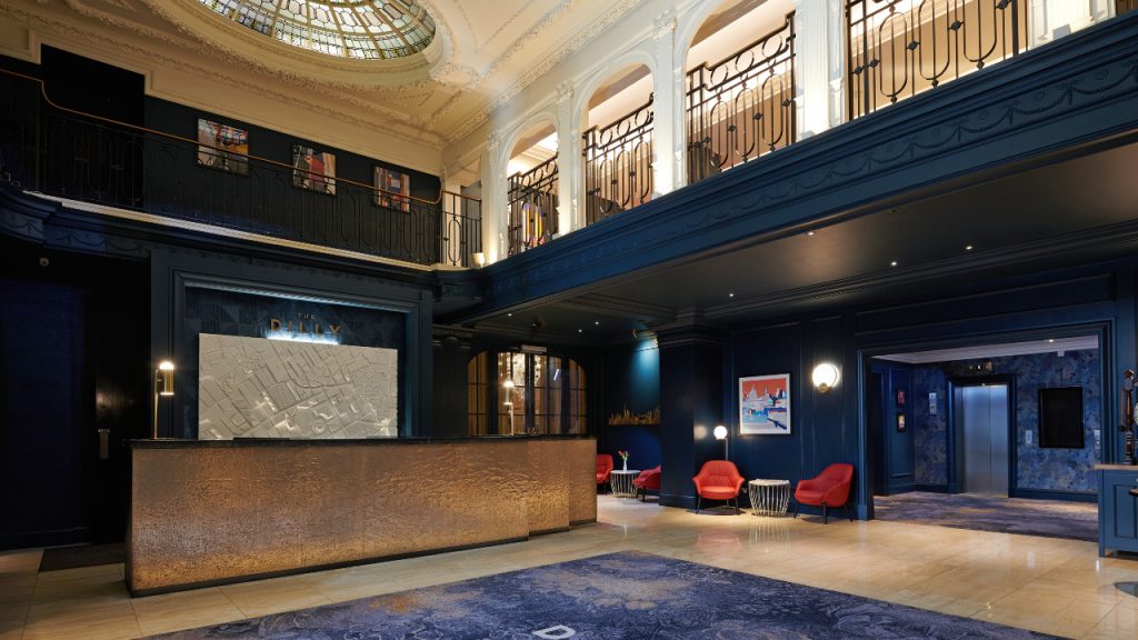 It’s an aim which asserts itself the moment the visitor enters a stunningly appointed lobby in which Hague Blue paintwork mingles with maps of London, flecks of coloured light projected via stained glass and an imposing “Dilly” lettering sculpture hanging from the ceiling, all overlooked by a mezzanine area, Balcony at The Dilly, which serves drinks – Chapel Down fizz, London-distilled Bimber whisky, Camden Ale – for suite guests.