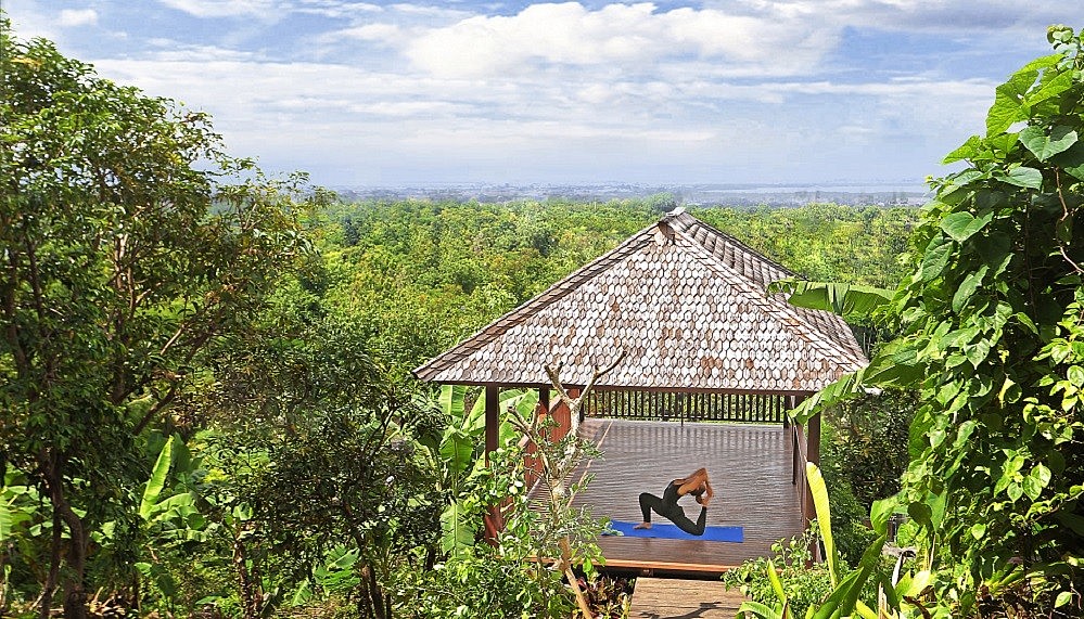 The anthropology lesson goes for a deeper dive in the rooms. Named after emblematic Indonesian islands – Bali, Lombok, East Java, West Java, Sumba and Sumatra – each evokes its namesake’s endemic culture. Therefore, you’ll find Sumbawaneseikat fabrics, urat masks from Lombok and Javanese shadow puppets – plucked from Linda’s extensive collection – to anchor each room with a sense of place. Each overlooks the lush garden, where the yoga pavilion is situated, and unified by dark stone staircases that lead, inevitably, to the lounge. Here – where the view is the grandest – is where guests can laze the day away with cocktails, floating on a beanbag in the swimming pool.