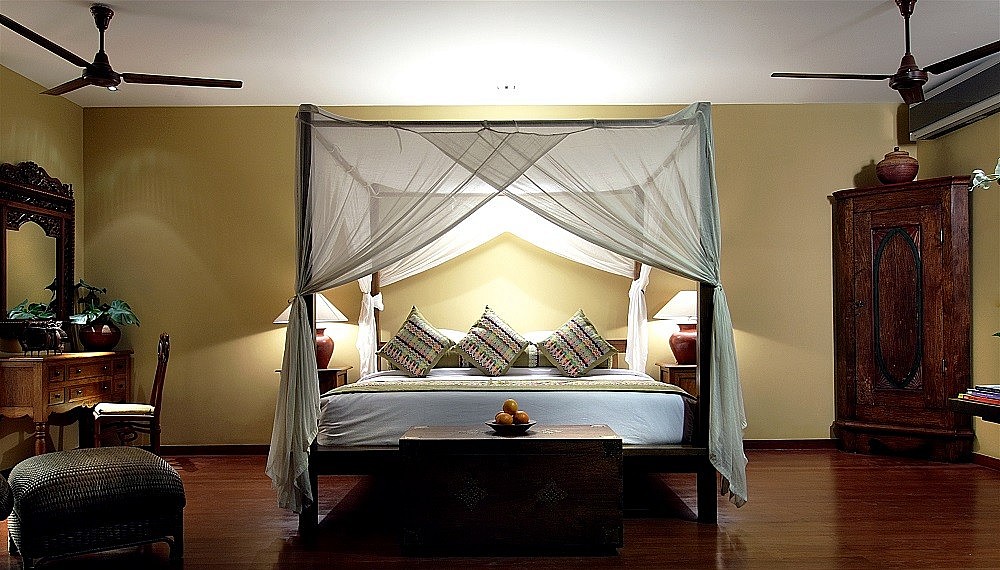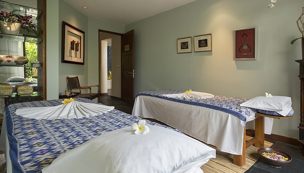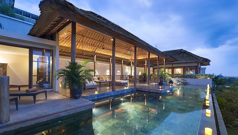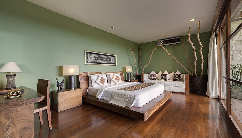 Designed with the eminent Balinese architect Popo Danes and undergoing an extensive revamp last year, The Longhouse (from US$975++/RM4,010 a night for the entire villa) approaches the subject of inspiration subtly. While each of six rooms can be rented separately, villa bookouts are preferred as it gains the party unfettered access to the property, stretched out across three storeys along the ridge of the hill. Accessed through a deceivingly small driveway, an elevator whisks guests up to the lounge on the second floor, where requisite thatched ijuk roofs crown a space that encourages the wind to explore. Geoffrey Bawa would approve. Here, a clean layout becomes a canvas for restrained ornamentation – alcoves along the pale stone walls evoke painted scenes from the Ramayana epic, while colourful gasing (tops) are turned horizontal into decorative pieces.