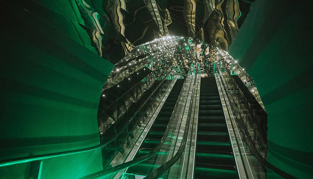 The arrival experience at members’ club 1880 is rather surreal. You ascend via an escalator housed in a tunnel of faceted metal. Pinpricks of light illuminate the metallic surface, giving the tunnel a futuristic, space-age feel. Entering the reception area, you are greeted by a glowing crystalline structure, a 1.5 tonne rose quartz mined in Madagascar.