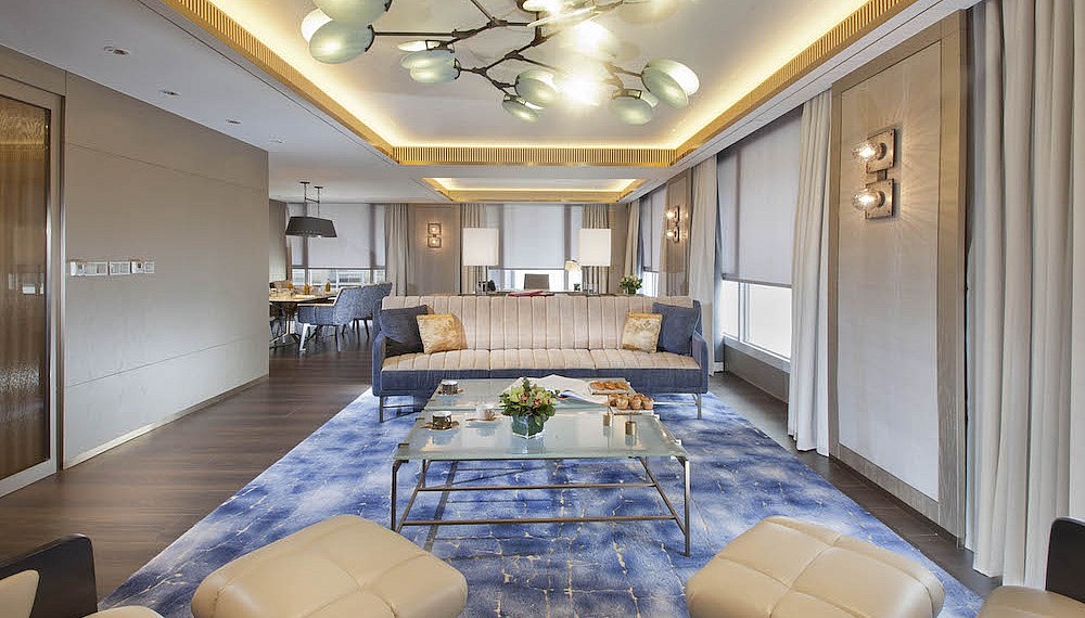Living areas offer velvet-soft sofas and hand-tufted rugs, while a bespoke desk makes it easy for one to remain productive and mix business with leisure. A master suite with walk-in dressing space is connected to the spa-inspired marbled bathroom, replete with a deep soaking bathtub and walk-in rainforest showers.