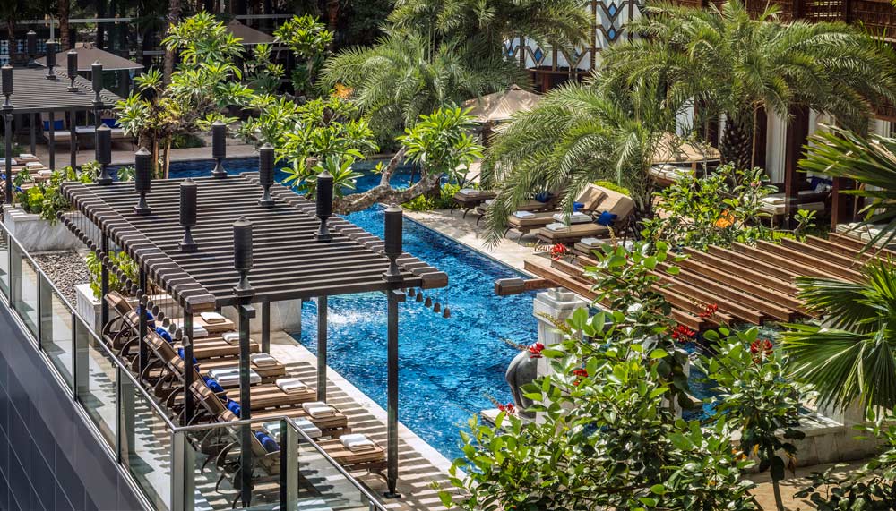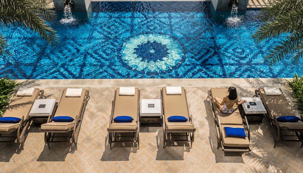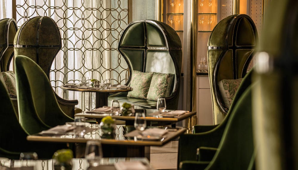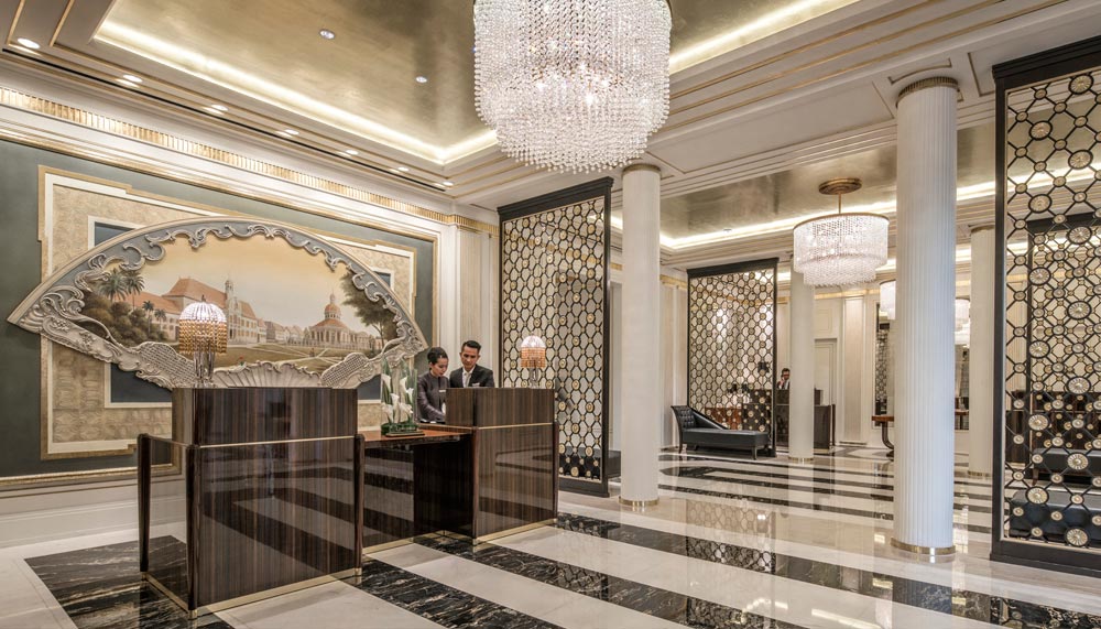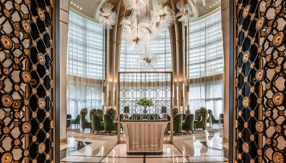The hotel’s all-day dining Palm Court restaurant also exudes a vibrant outlook with floor-to ceiling windows, an outdoor garden terrace and olive-coloured furniture. Bismarck palm tree panels (a locally-grown tree), branch from the floor to the 13-m coupla ceiling, while a customised 14-segment Lasvit chandelier made of over 4,200 crystals cascades to the breakfast buffet table. Meals served are equally foretelling of the city’s future. The menu, created by executive chef Marco Riva, includes specialties like Javanese lobster udon laksa and king prawn tom yum risotto.