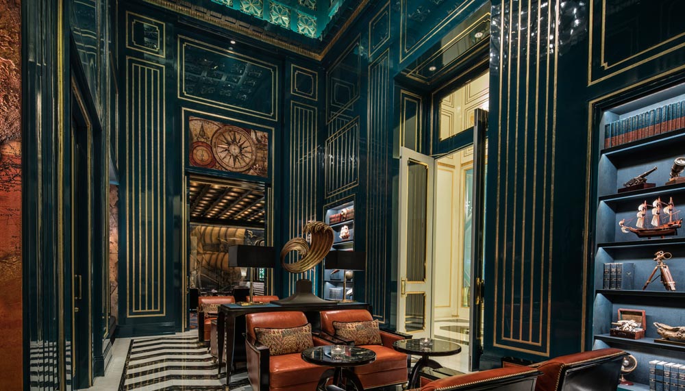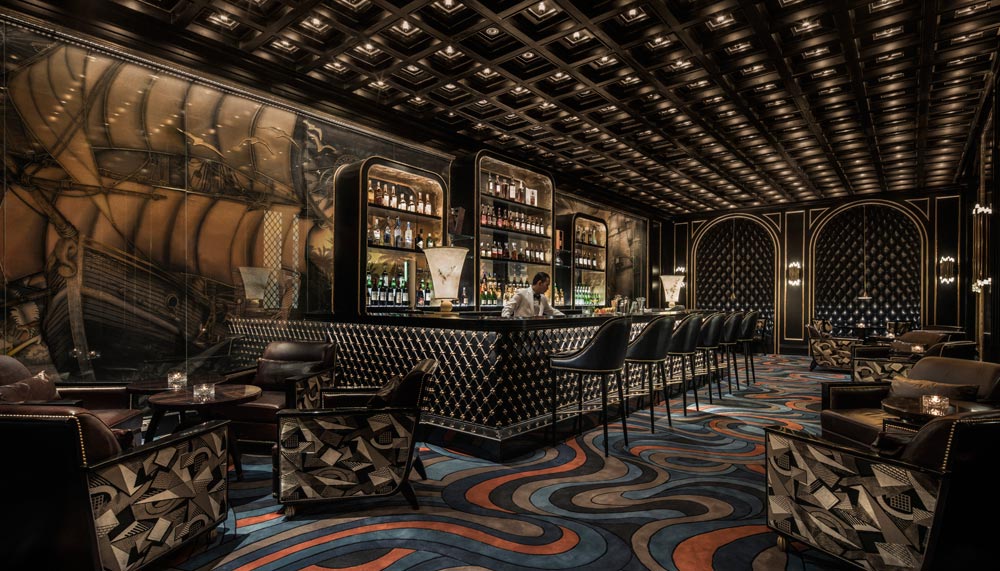 The journey takes a sharp and dark turn at The Library, a lounge plastered with browned and crumpled maps, compass roses and barometers, and adorned with telescopes, sailboat miniatures. Fitted with burnt orange and dark teal furniture, it foretells an arduous journey through the seas. From there, guests can either navigate their way to Nautilus bar where the storm has passed and night has fallen, or La Patisserie, a dainty confectionary set within a cream-and-turquoise room that promises brighter and calmer days ahead.