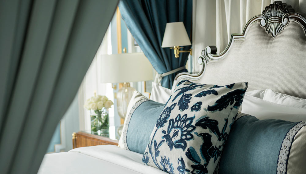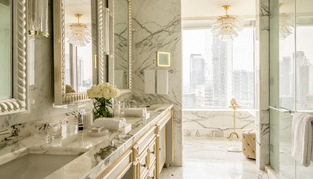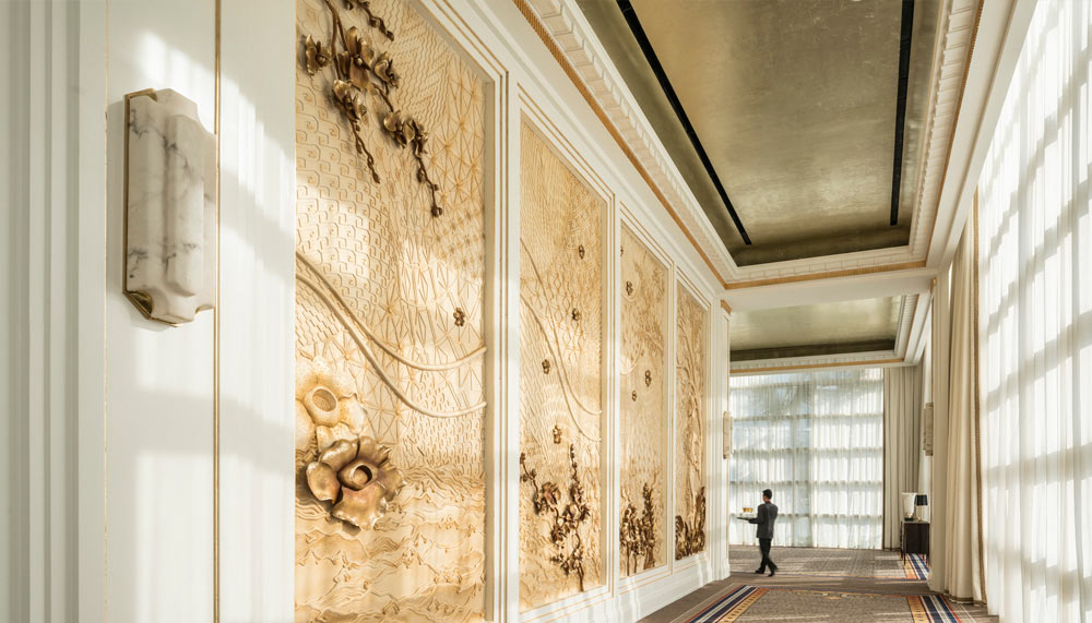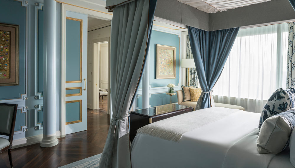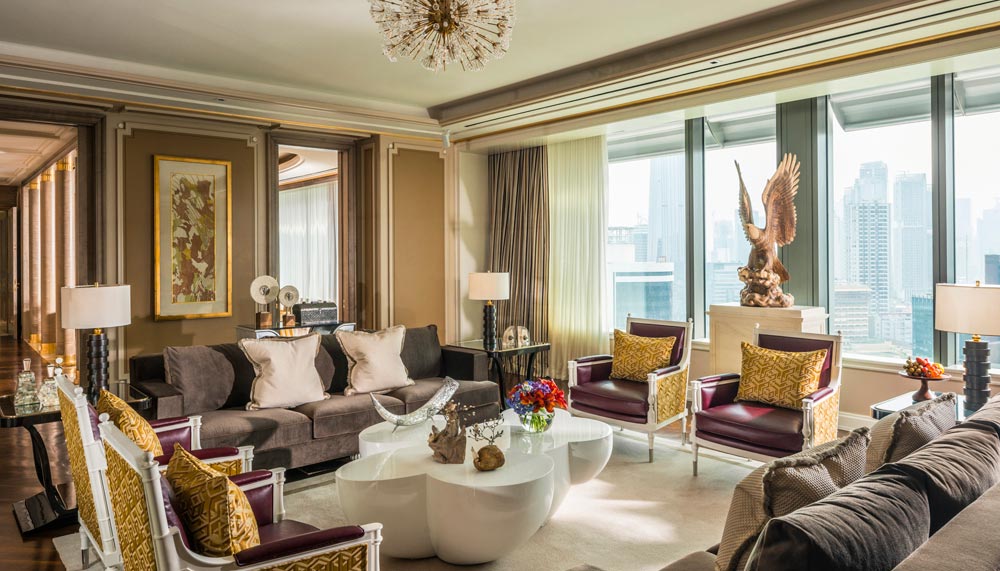 Modern city life is depicted in the one-bedroom Executive, Deluxe Executive, and Premier suites. Each is generously spaced between 62 – 68sqm, and is tastefully designed in muted tones of lilac, cream and grey that soothe the soul. Instead, accents of gold and small pops of colour bring the suites to life. The brightly-lit Italian white marble bathroom is kept free of clutter, emphasising on space with the bare minimal of a walk-in closet, soaking tub, twin-head shower and twin sinks. Champalimaud instead draws attention to the chaise lounge that reflects the community spirit of Jakartians. Art pieces are replaced by Chinoiserie wall panels with silk floral motifs, a curved tufted daybed, along with his and hers minimalist-styled baroque armchairs, the latter marked with a gold mahkota fixture.