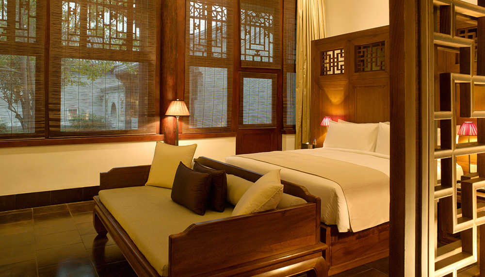 In all, the Aman Summer Palace comprises 51 abodes divided among the 9 courtyards…. or specifically, 10 courtyard guestrooms, 8 suites, 17 deluxe suites, 7 courtyard suites and an Imperial Suite with three separate pavilions, one for private living, one for receiving and one for communal activities and studying. Within the suites, the décor echoes the Imperial period, while the furniture and trappings are all crafted using traditional methods and materials amidst painstakingly restored interiors. Authentic materials such as Jin clay tiles and classic elements like draped bed alcoves mix together with more modern elements, such as open ceilings exposing roof beams and structural columns, as well as sumptuous bathrooms.