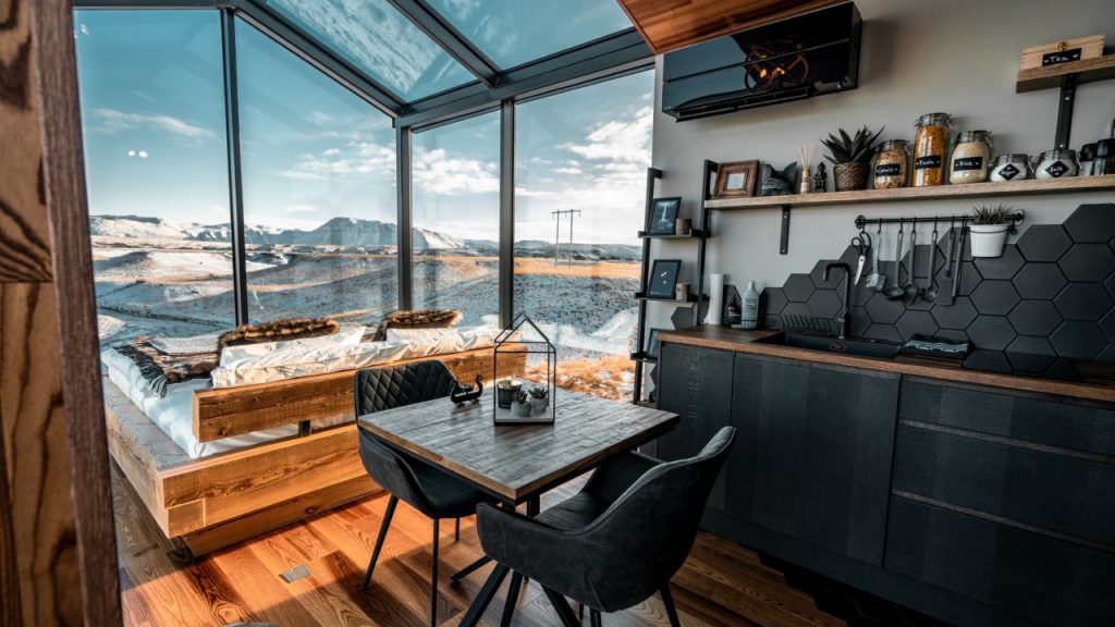 Named after Norse mythology characters, the lodges at the Panorama Glass Lodge Escape can each sleep two in a custom-made, king-sized bed and come fitted with a fully equipped kitchen and an ensuite with a rainfall shower. While inside, you’ll enjoy panoramic views of the Northern Lights, the Hekla volcano and the expansive arctic tundra. Since the area is remote and free of light pollution, you can also partake in a spot of stargazing.