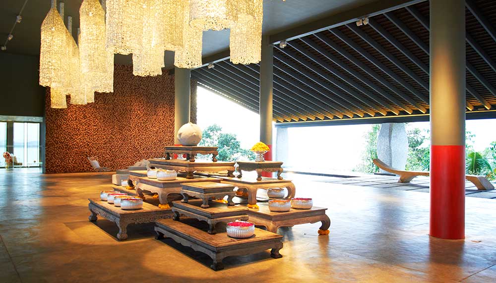 Situated on a hillside and offering magnificent views of Phang Nga Bay, Point Yamu is a fresh architectural interpretation of Thai luxury. Its interiors, which were designed by renowned interior designer Paola Navone, are open and airy. The lobby is an enormous open-air space with an altar-like installation made of stacked Thai tables and huge swaying lobster-trap lampshades.