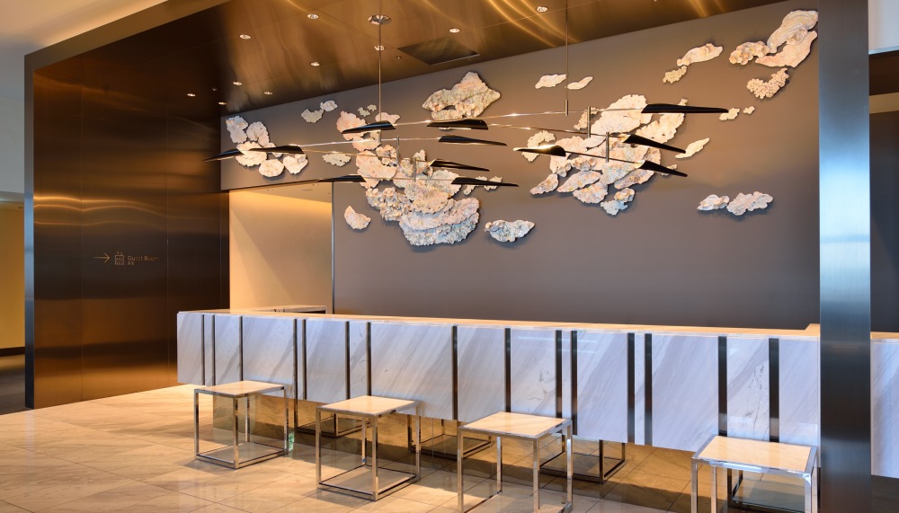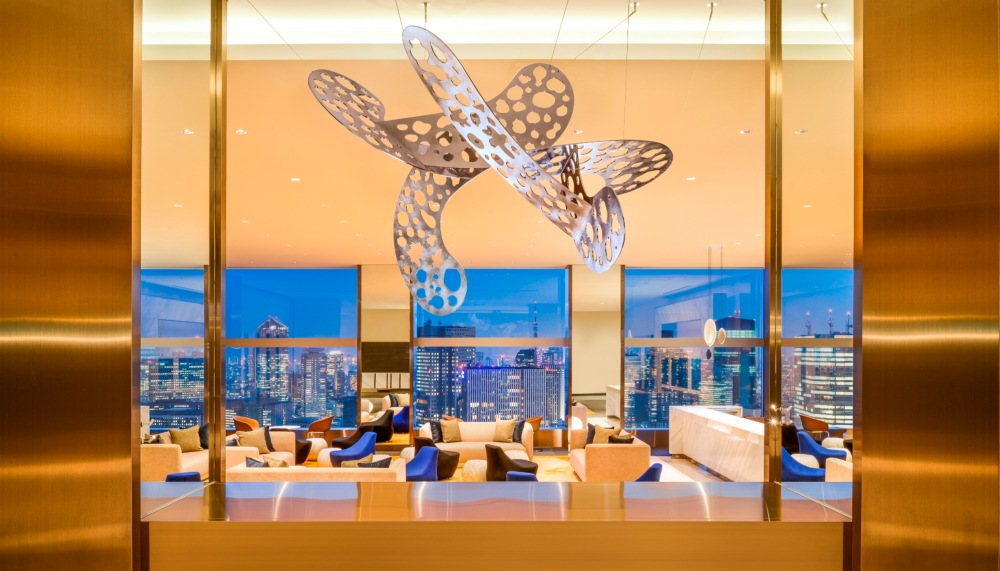 If the mansion is a reflection of Tokyo’s recent past, the hotel is a striking picture of its present — a city pulsating with art, culture and design. The hotel’s arresting artworks and design elements referencing nature and levitation create a stylish, dreamlike tableau. At the 36th-floor elevator lobby, I am greeted by a futuristic sculpture evocative of clouds and wind by Atsushi Hosoi. This cloud motif is also evident in the pearlescent ceramic and porcelain assemblage by Asaho Kamiya at the main reception area, while the metal sculpture by Takenobu Igarashi is reminiscent of windflowers.