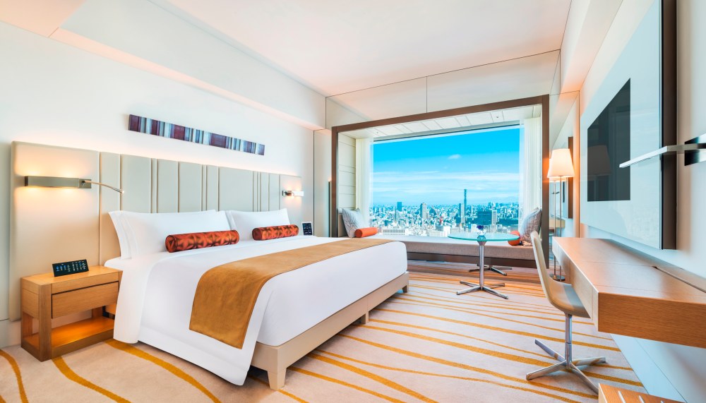 At each floor of the elevator lobby leading to the guestrooms are niches displaying whimsical glass sculptures, from abstract works to intricate organic forms and geometric butterflies. Artworks such as metal sculptures and contemporary paintings adorn the plush guestrooms, and spacious daybeds that anchor massive windows afford iconic views of Tokyo — from my room, I was afforded a view of the imperial grounds, skyscrapers and on towards the snowcapped Mout Fuji.