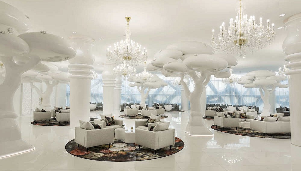 The hotel’s sculptural façade gives way to expansive common spaces and 270 rooms and suites, all brought to life by Dutch interior designer Marcel Wanders (who is fresh off a furniture collaboration with Louis Vuitton) and South West Architecture. The dreamlike design is a vibrant mashup of east and west: think Alice in Wonderland-esque sculptures and pop art prints alongside traditionally Middle Eastern motifs and icons.
