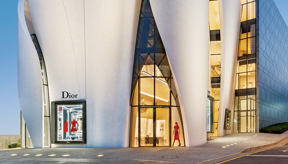 A short stroll away, Dior’s flagship store opened its doors last summer in a sculptural structure by the French architect Christian de Portzamparc. I wander inside to find an ethereal landscape designed by Peter Marino, where curved mirrors and glass create a sleek backdrop for the fashion house’s latest trends. The fabulous illusion, however, is shattered when, in an attempt to make my way down the spiral stairway, I nearly miss the reflective steps, catching myself before bouncing down and out into the street. “Everybody does that,” says a nearby sales clerk with a smile.