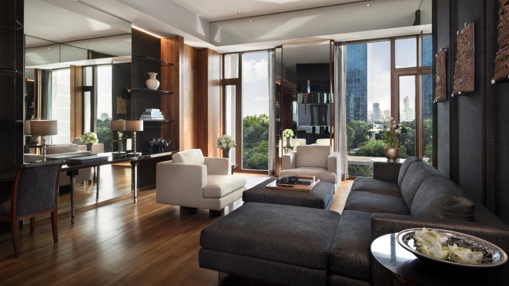 The Club Suites, which launched in 2018, comprised Tuttle’s final project for The Sukhothai Bangkok, a property through his exacting aesthetics became an instant hit with the international jetset. In these rooms, he’d imparted distinct modern edges, while toning down classic Thai accents. Instead of ornate woodwork, there are more minimalist trays and charcoal modular sofas. What hasn’t changed however, is the deep understanding of room flow and how guests might utilise the space. There are ample spots to place essentials such as reading glasses, watches and books without having the need for blurry eyed searches for these items in the middle of the night. The same considerations can be noticed in the vast bathroom with its three-dimensional mirror splices, a Tuttle design signature, which offer pleasing and convincing impressions that you’re slimmer than you actually are.