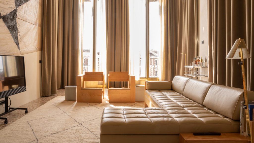 All rooms come with a host of amenities. These include Bang & Olufsen televisions, fully stocked minibars, and bath products from The Erose in specially designed aluminium cans. Jars filled with traditional Venetian biscuits are accompanied by handwritten notes to welcome guests. Marble, stone and brass bathroom fixtures, as well as leather headboards and sofas embossed with patterns from the original Golden Goose sneaker designs create a unison narrative between rooms unique to this hotel. The overall effect is incredibly personalised, an appreciated feature in a city heaving with tourist-focused spaces.