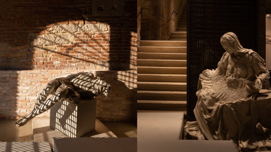 From the moment guests arrive at the hotel, they are struck by the two features that visually define The Venice Venice Hotel: art and a rare 180 degree view of the Grand Canal. The low lit water entrance features a commissioned sculpture from Fabio Viale entitled Pietà Senza Cristo, which is an homage to Michelangelo’s Pieta in the Sistine Chapel. Sunk into a shallow pond, the sculpture, which sees Christ wrenched from Mary’s lap leaving a scarred carving of stone, introduces the hotel’s intention to bridge past and present.